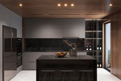 Визуальная коррекция пространства — матовый черный может быть инструментом зонирования или акцентирования. Например, выкрашенная в матовый черный вытяжка или остров становятся визуальным центром композиции, не перегружая пространство излишним блеском.