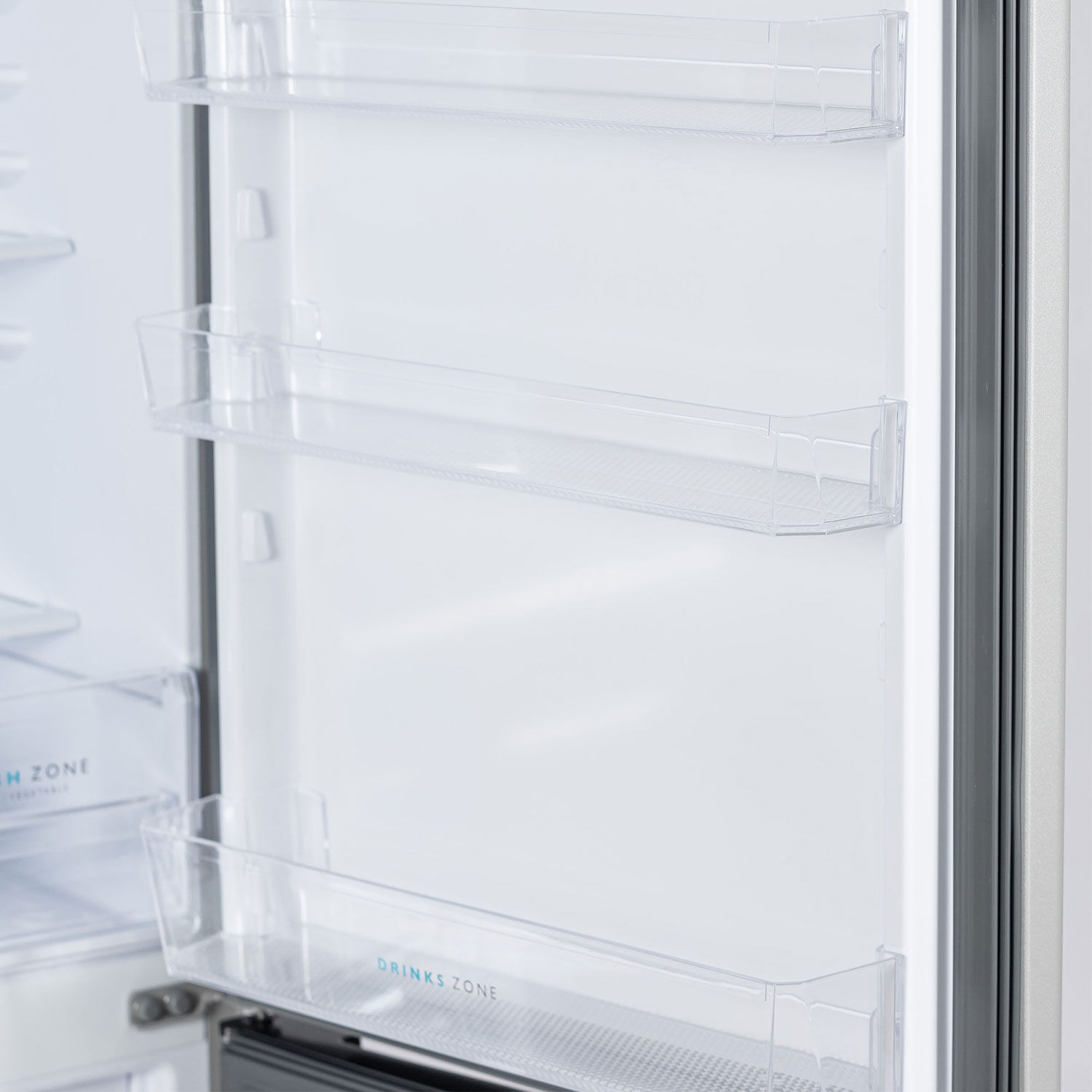 - 4 дверных полки – удобное хранение бутылок и банок – 4 полки на дверце позволяют удобно разместить бутылки, банки, соусы и мелкие упаковки. Всё на виду и под рукой.
