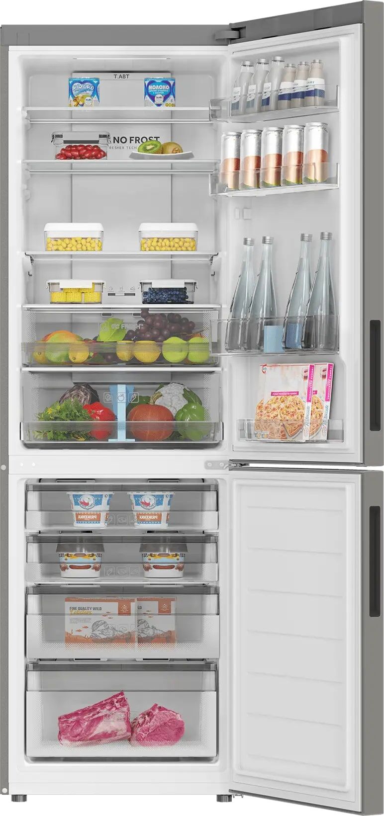 - Технология Total NoFrost и MultiFlow – полная система No Frost в обеих камерах навсегда избавляет от инея и ручного размораживания. Технология MultiFlow обеспечивает равномерное распределение воздушных потоков по всему объёму холодильника, поддерживая стабильную температуру на каждой полке.