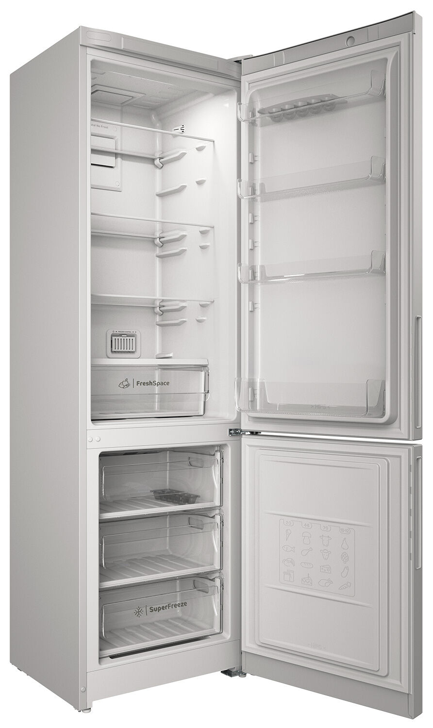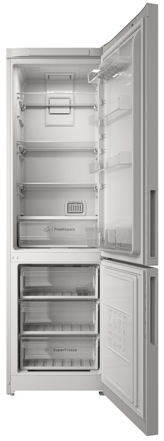 Двухкамерный холодильник Indesit ITR 5200 W в классическом белом цвете – это флагманская модель в линейке холодильников Indesit, предлагающая максимальную вместительность, современное электронное управление и передовые технологии хранения. При высоте 196 см и ширине 60 см модель предоставляет полезный объём 325 л (247 л в холодильной камере + 78 л в морозильной). Система No Frost в обеих камерах избавляет от размораживания, функция Push&Go обеспечивает быстрое охлаждение после загрузки, а ускоренная заморозка Freezer Control сохраняет качество свежих продуктов. Сверхпрочные полки из ударопрочного стекла выдерживают нагрузку до 100 кг. Внешний дисплей и визуально-звуковая сигнализация делают использование максимально комфортным и безопасным.