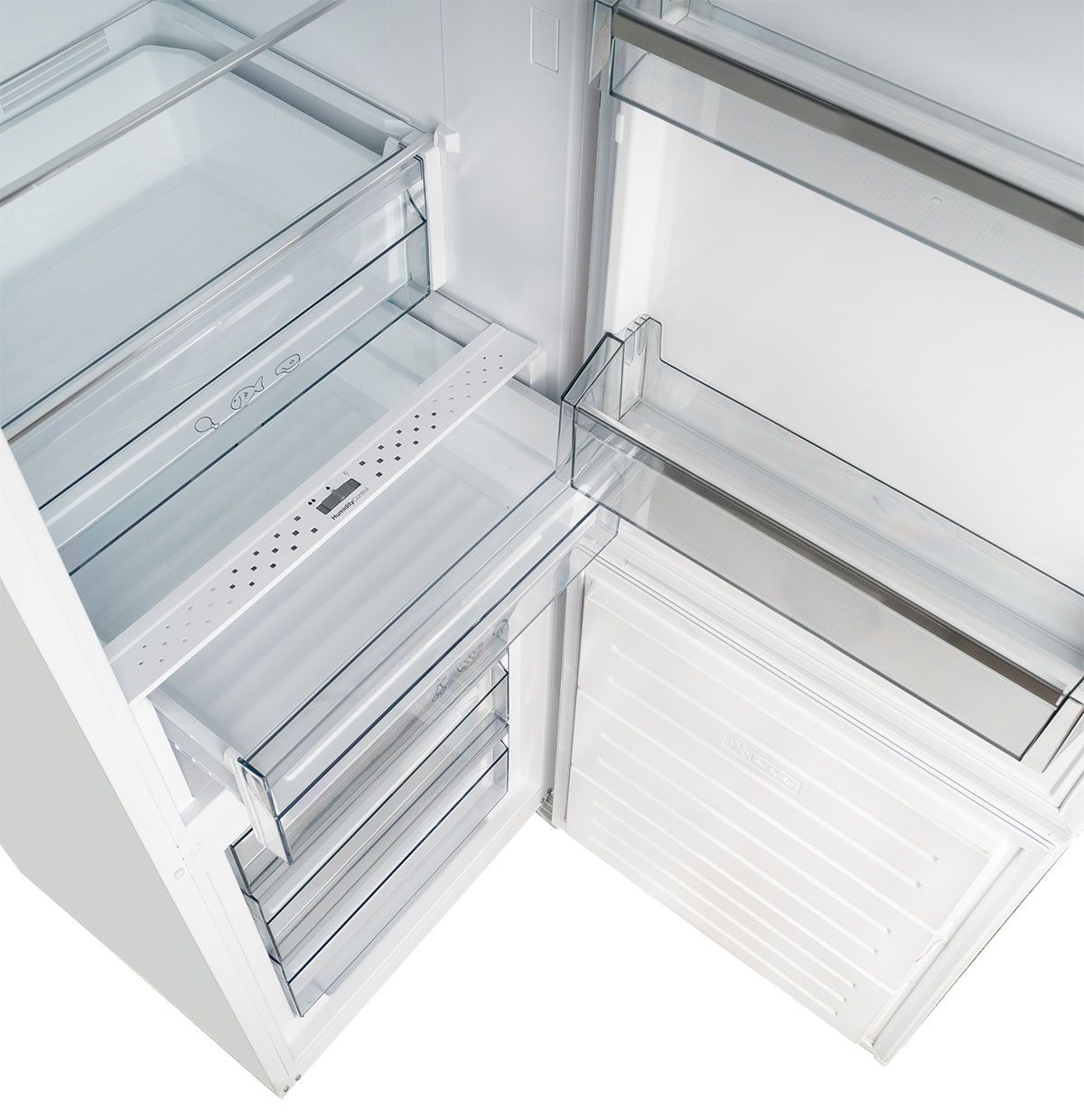 Практичное оснащение — 4 стеклянные полки с хромированной окантовкой, ящик для овощей, 3 ящика в морозилке и лоток для яиц.
