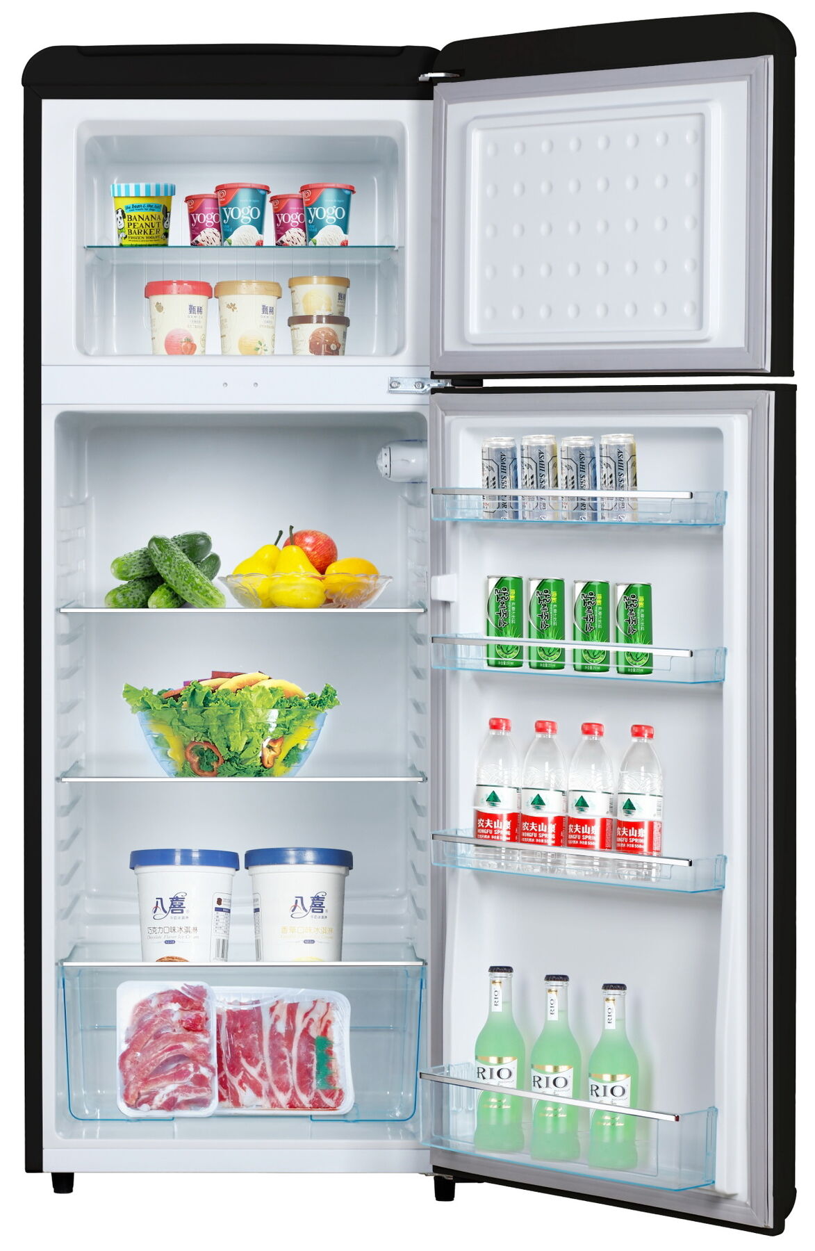 - Винтажный дизайн с хромированными ручками и плавными линиями – элегантный чёрный корпус, классические хромированные ручки и узнаваемые ретро-пропорции превращают холодильник в центральный элемент интерьера. Создаёт атмосферу уюта и стиля 50-60-х годов в современном исполнении.