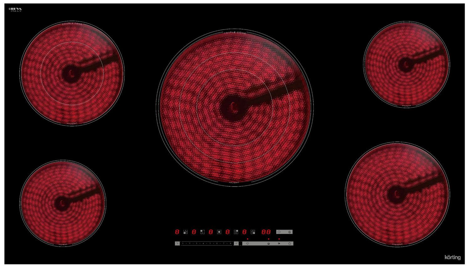 Мощная конфигурация 5 зон — центральная трехконтурная (до 2.7 кВт), две конфорки по 2.0 и 1.8 кВт, две конфорки по 1.2 кВт. Идеальный баланс мощности и гибкости.