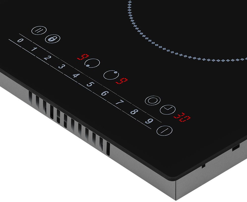 - Слайдерное сенсорное управление – интуитивное регулирование 9 уровней мощности для каждой конфорки, активация зоны расширения и настройка таймера отключения (до 99 минут).