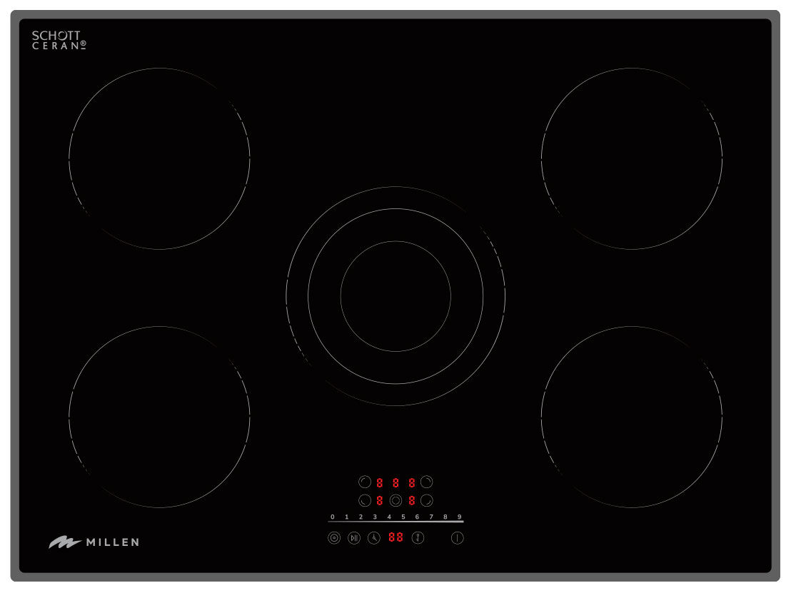 Электрическая варочная панель Millen MEH 702 BL – премиальная мощность, пять конфорок Hi Light, трёхконтурная зона и сенсорный слайдер