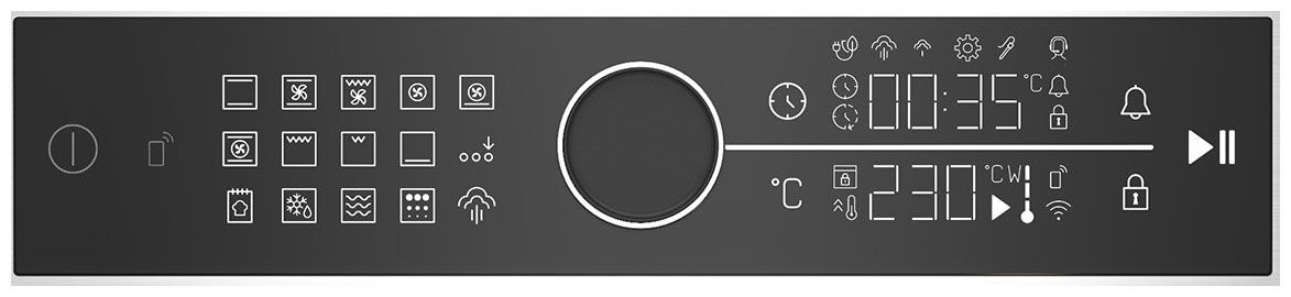 - Режимы: верхний и нижний нагрев, верхний+нижний+конвекция, гриль+конвекция, кольцевой нагревательный элемент, кольцевой+нижний нагрев, верхний+нижний+кольцевой, гриль, малый гриль, нижний нагрев, размораживание, добавление пара и др.