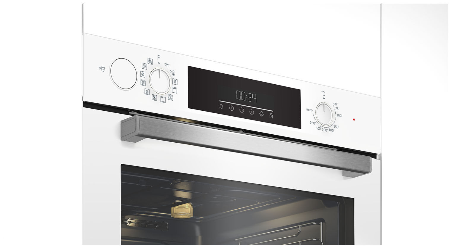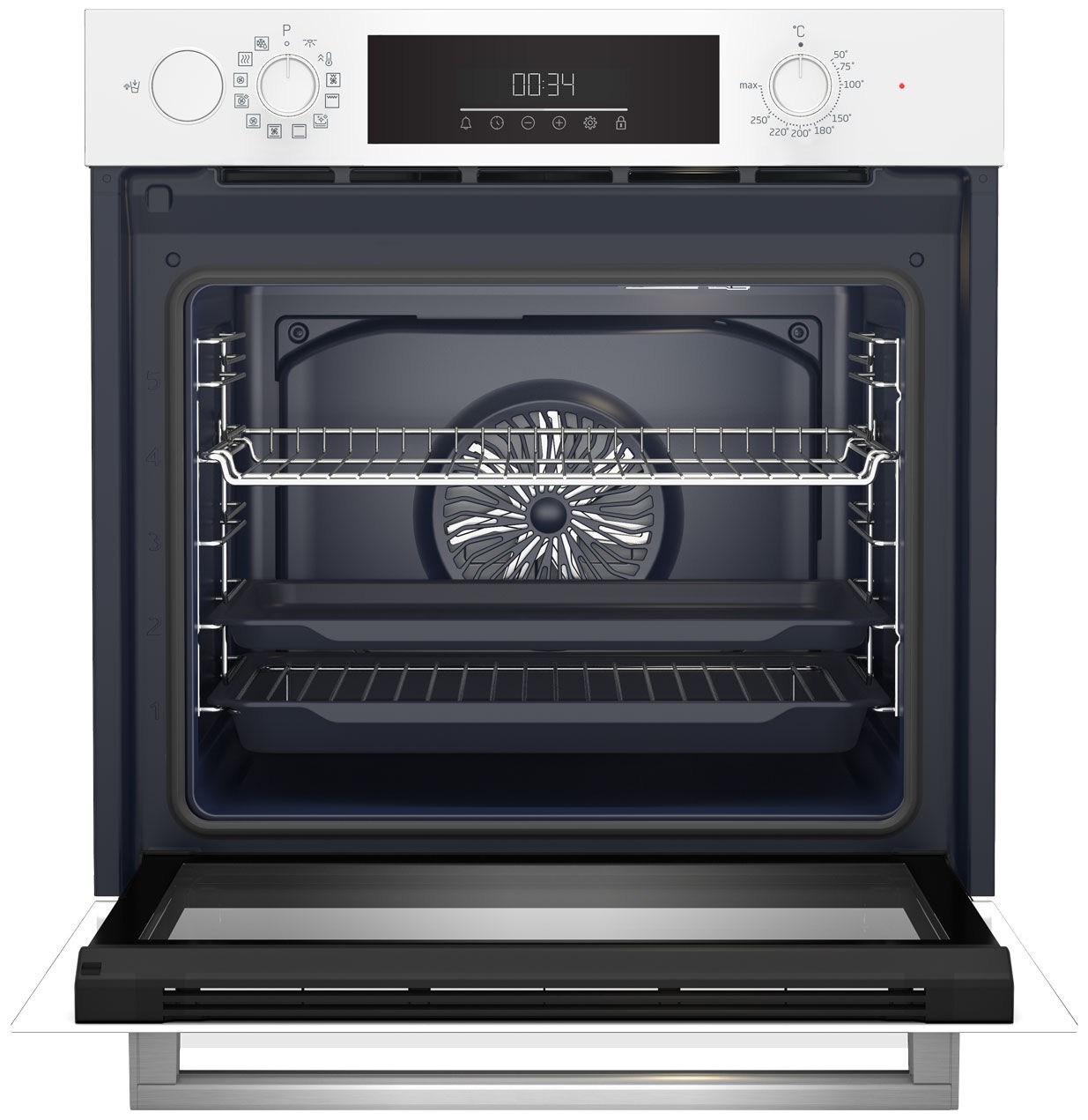 - Утапливаемые переключатели и дисплей – эргономичные поворотные ручки утапливаются в панель, что обеспечивает дополнительную безопасность и придаёт духовке лаконичный вид. Цифровой дисплей отображает время, температуру и настройки таймера.
