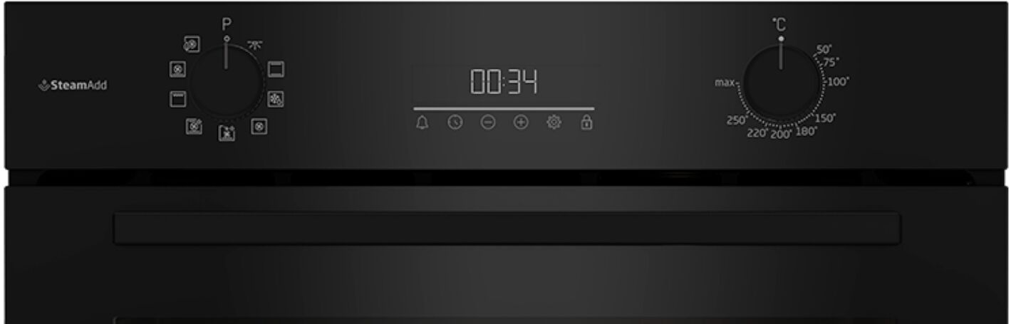 - Современное управление и дизайн – поворотные переключатели и LED-дисплей с панелью из стекла обеспечивают интуитивно понятное управление. Затемнённая дверца и чёрный цвет придают духовке элегантный вид. Блокировка от случайного нажатия защищает от изменения настроек.