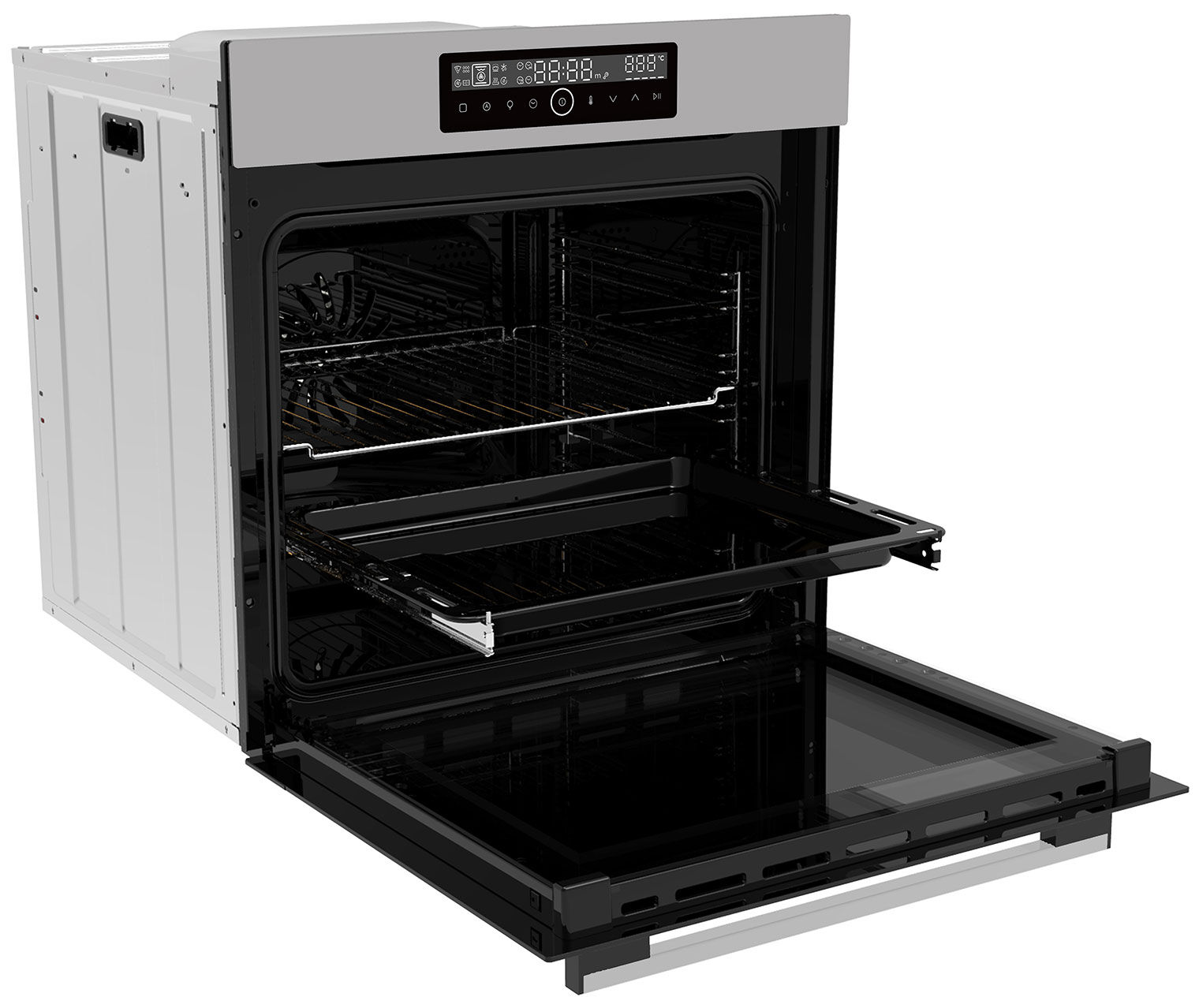 - Максимальный объём и комфорт – вместительная камера 78 литров с 8 уровнями приготовления позволяет готовить огромные порции и экспериментировать с многоярусной выпечкой. Телескопические направляющие на одном уровне обеспечивают безопасное выдвижение противня, а съёмные направляющие и дверца упрощают уход.