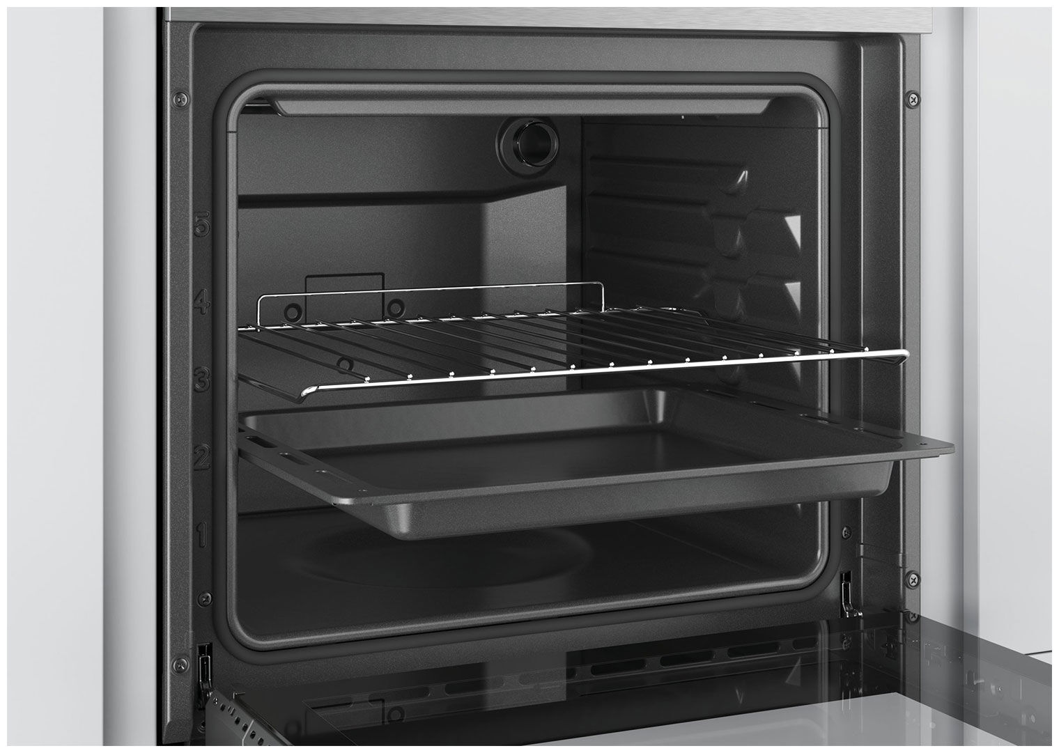 - Надёжная фиксация противней – специальный дизайн и форма полок с защитой от наклона гарантируют, что противни и решётки останутся в идеальном положении во время приготовления, исключая риск опрокидывания блюд.