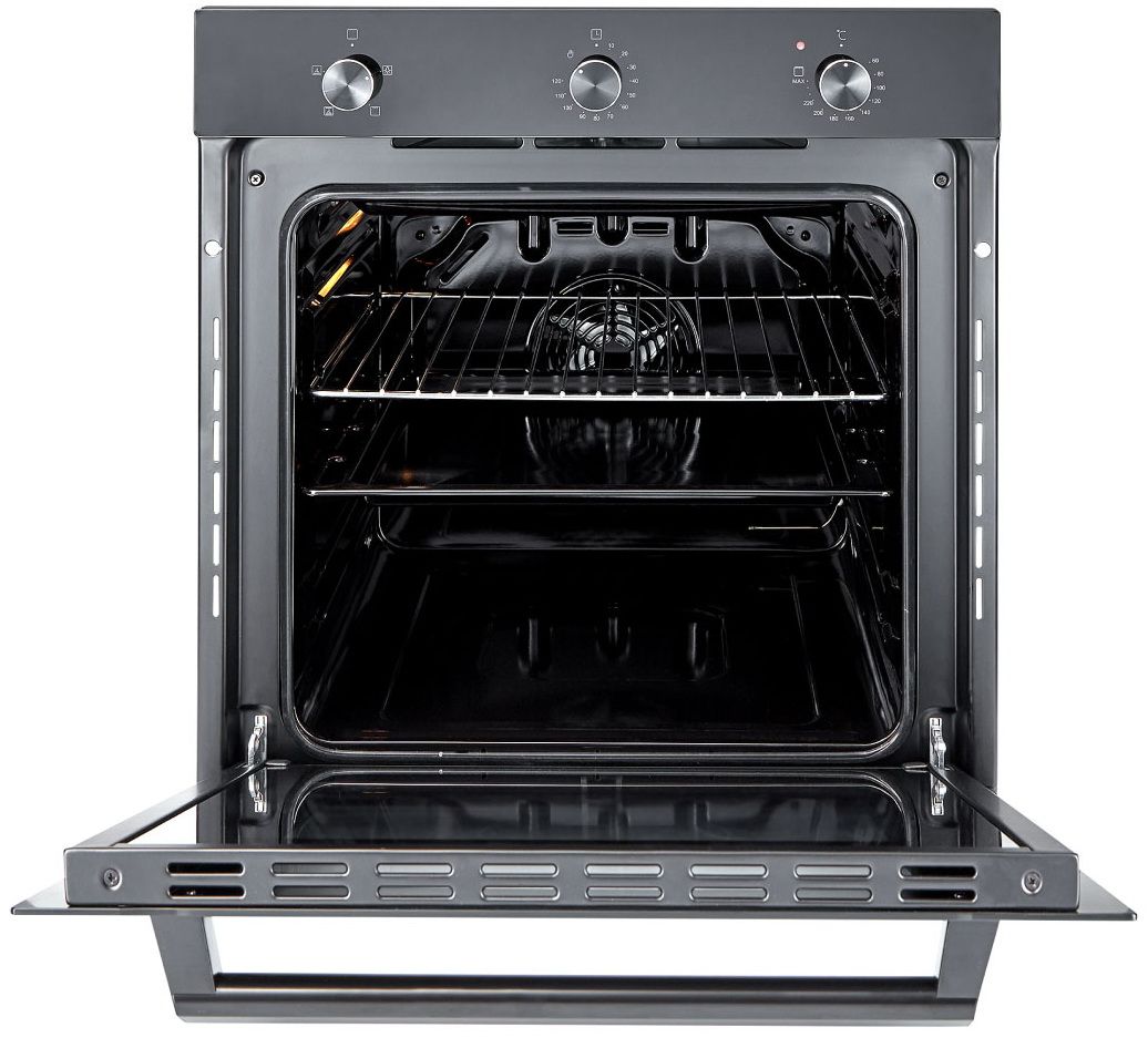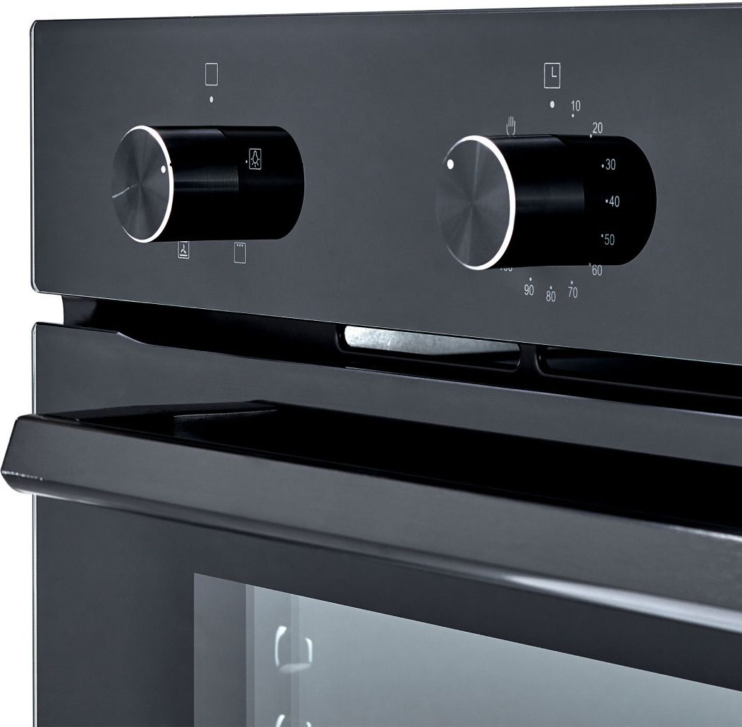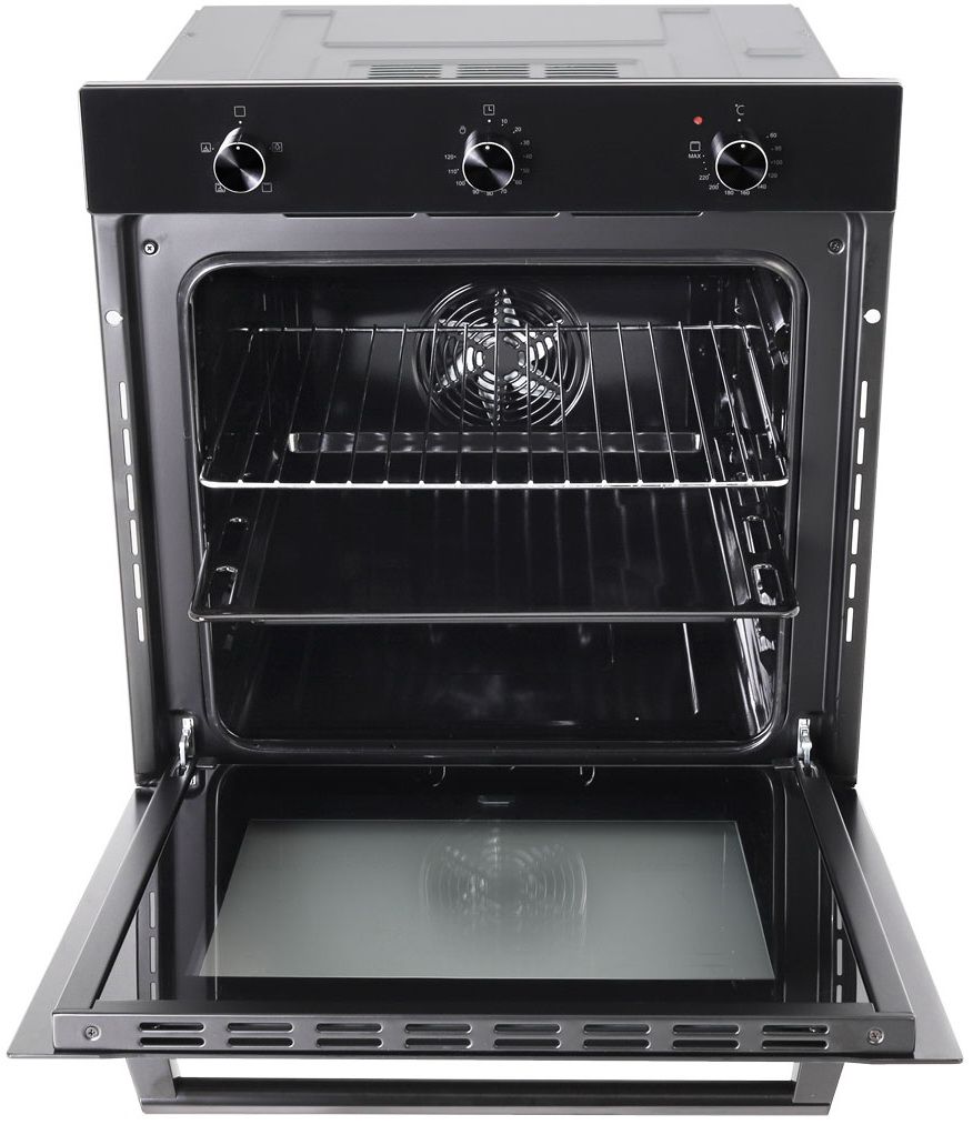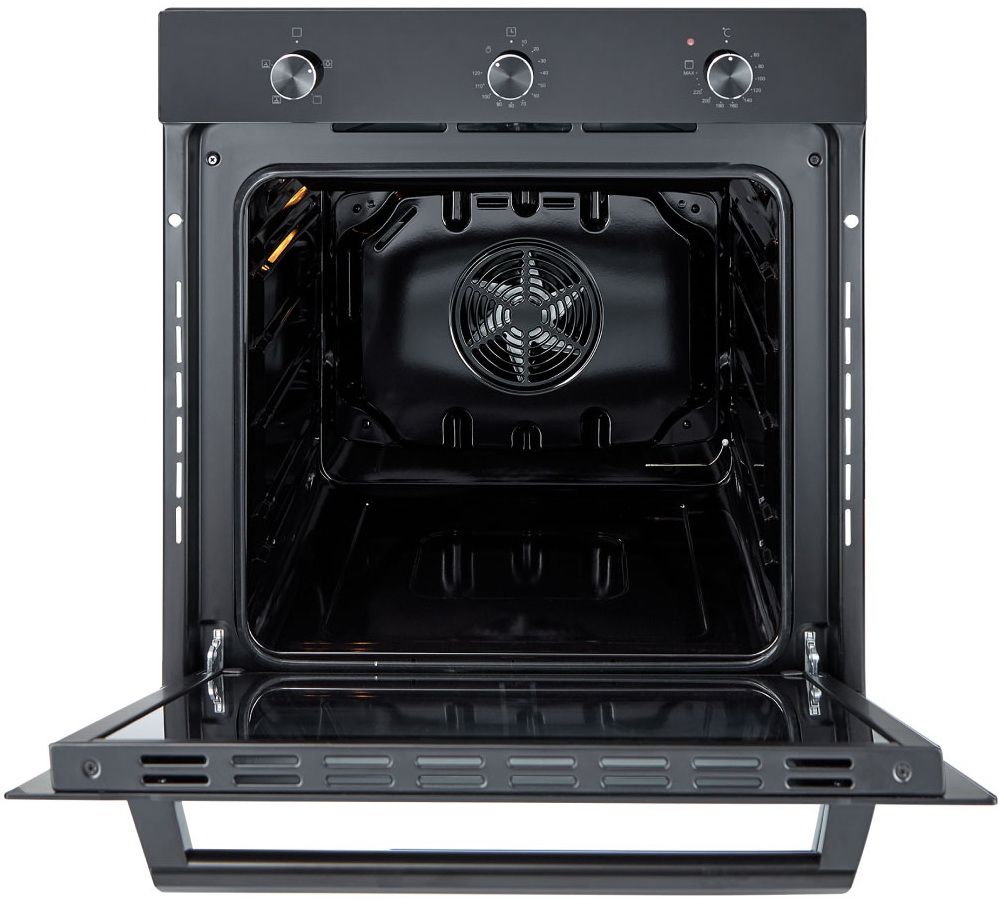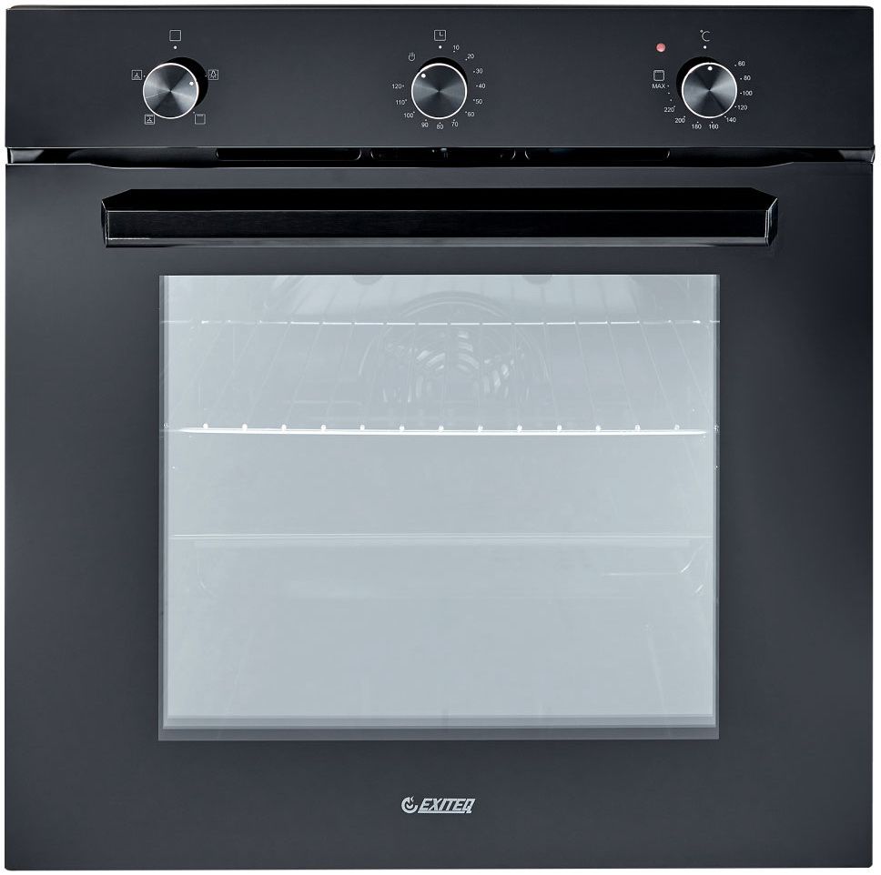 Встраиваемый электрический духовой шкаф Exiteq EXO-107 в черном цвете предлагает строгий дизайн и интуитивное механическое управление для легкого использования. Модель оснащена поворотными переключателями, тройным остеклением дверцы и системой плавного закрывания.