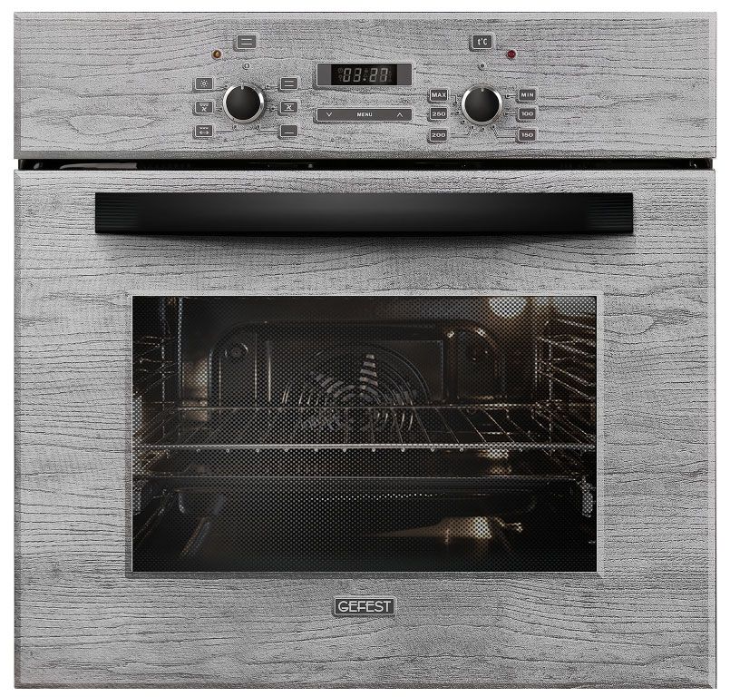 Духовой шкаф Gefest ДА 622-02 К35 в стильном сером цвете с фасадом, декорированным стеклом с текстурой дерева, сочетает элегантность и передовые технологии. Модель оснащена поворотными переключателями и сенсорным таймером со звуковым сигналом для точного контроля приготовления.