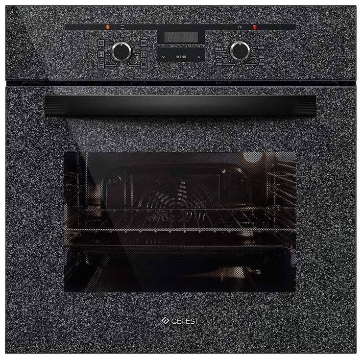 Духовой шкаф GEFEST ДА 622-02 К43 в строгом черном цвете с фасадом, украшенным стеклом с рисунком «текстура камня», объединяет современную эстетику и продуманную эргономику. Управление сочетает надежные поворотные переключатели и сенсорный таймер со звуковым оповещением.