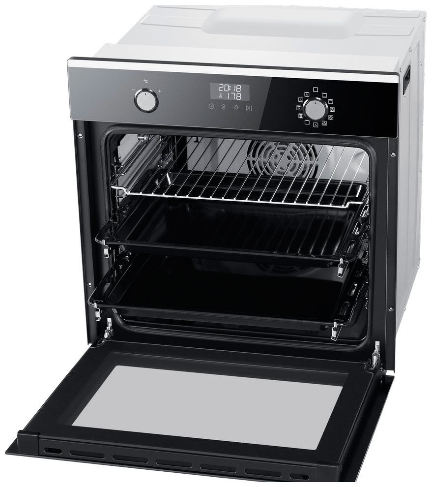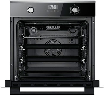 - Телескопические направляющие на 2 уровнях и плавное закрывание дверцы – противни выдвигаются плавно и полностью, обеспечивая безопасный доступ к готовящимся блюдам. Система плавного закрывания предотвращает хлопанье дверцы.