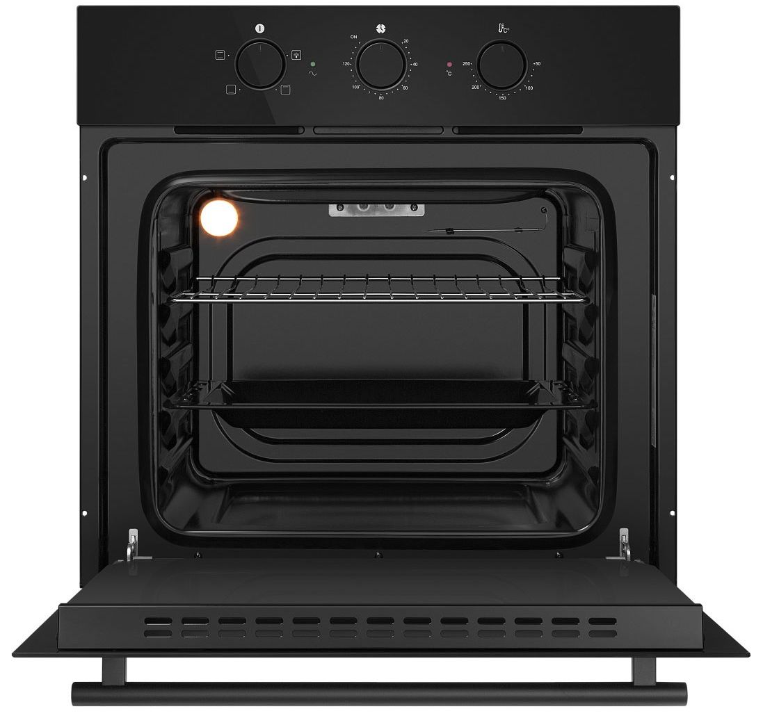 Встраиваемый электрический духовой шкаф Homsair OES604BK2 в черном цвете сочетает элегантный фронт из тонированного стекла и технологию "Холодный фронт" для максимальной безопасности. Модель оснащена утапливаемыми переключателями для легкого управления и поддержания чистоты.