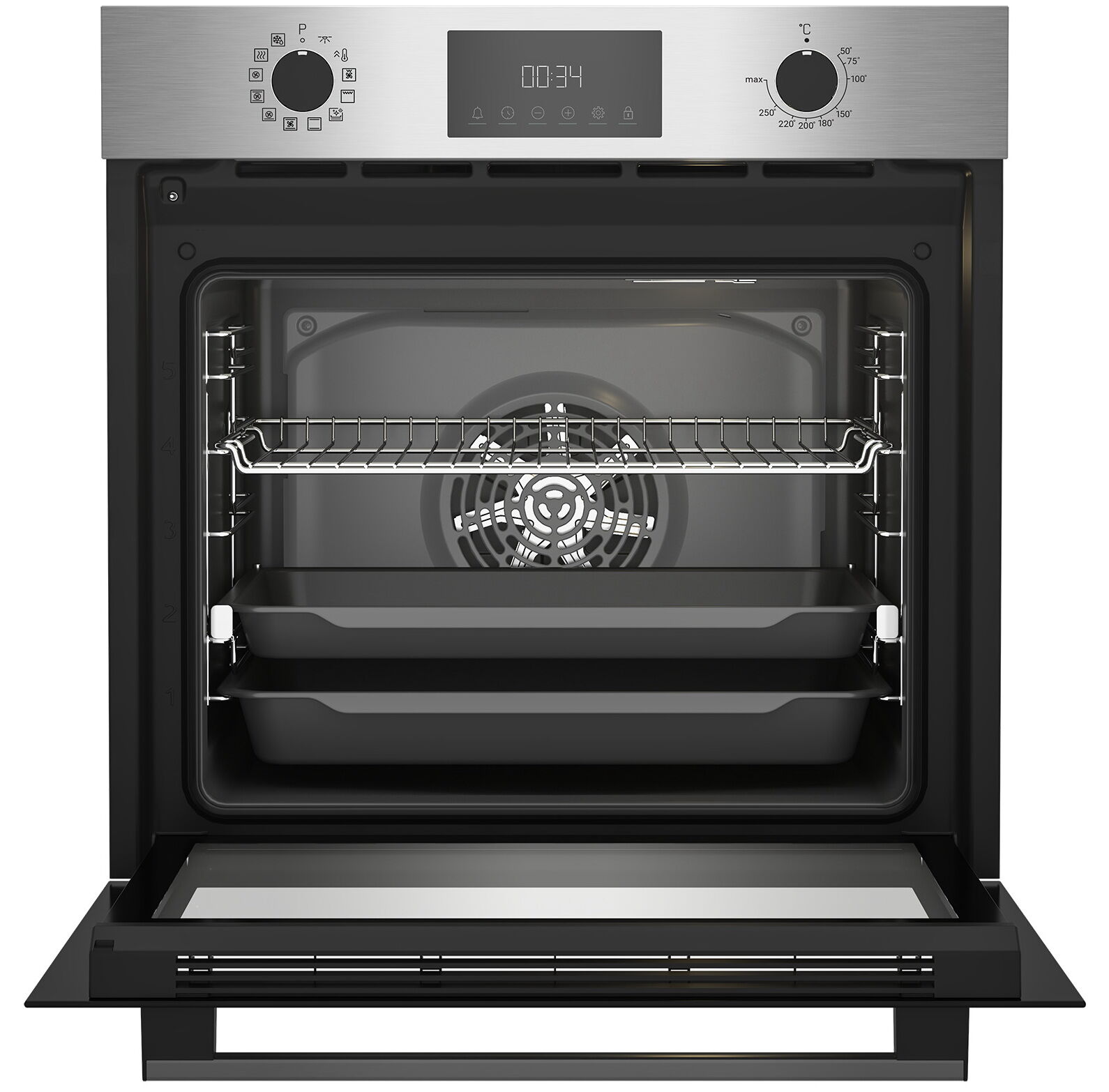 - Управление премиум-класса – эргономичная металлическая панель с утапливаемыми поворотными переключателями и встроенным таймером обеспечивает интуитивно понятный контроль всех 12 режимов и точную настройку времени приготовления.