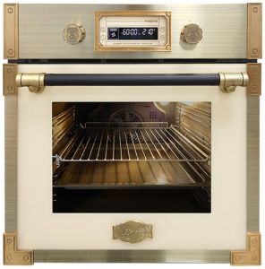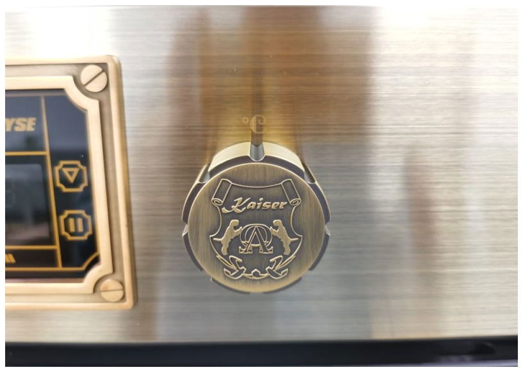 Духовой шкаф Kaiser EH 6427 ElfAD сочетает в себе ретро-эстетику и современные технологии. Модель выполнена в цвете «слоновая кость» с эксклюзивными элементами отделки «античное золото» в стиле ар-деко: кожаная ручка дверцы, массивные металлические вращающиеся ручки-джойстики и выпуклые гербы бренда. Термоотражающее стекло дверцы остается безопасным на ощупь даже во время работы, что особенно важно для семей с детьми.