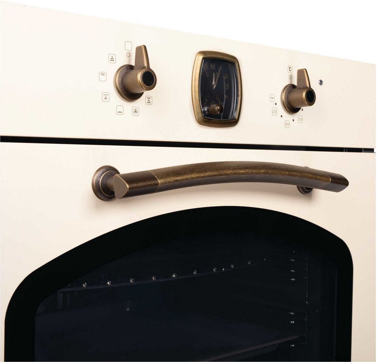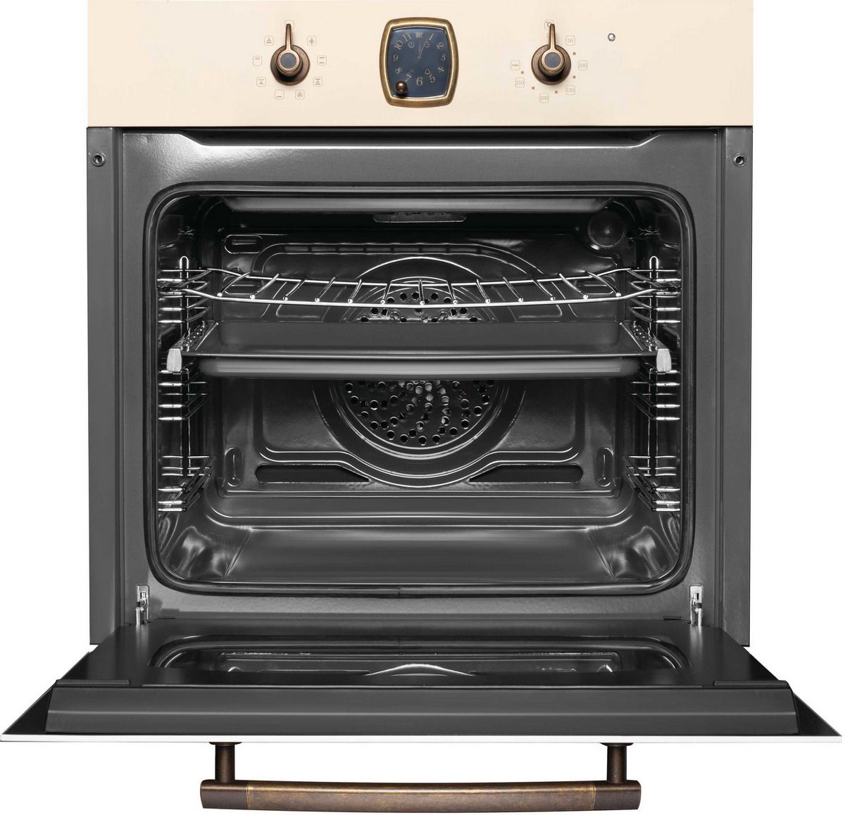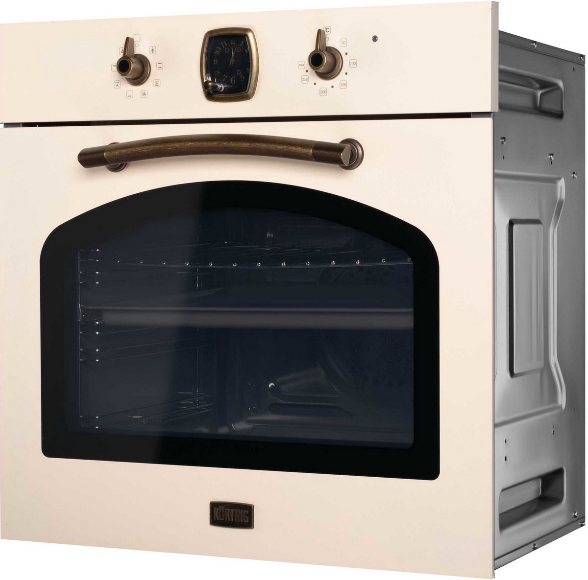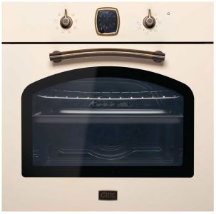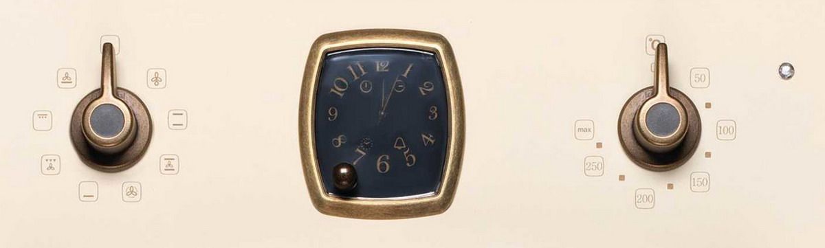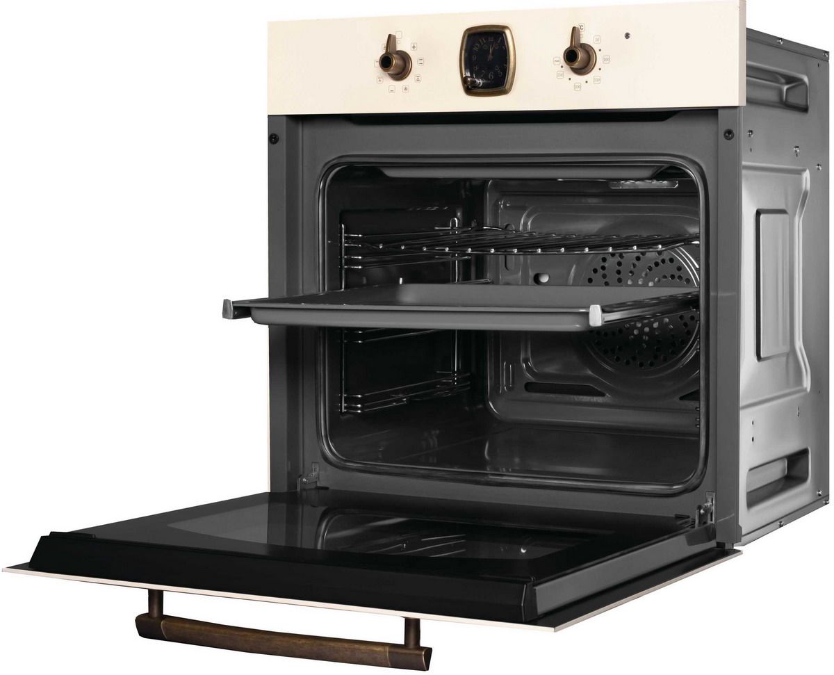 Встраиваемый электрический духовой шкаф Korting OKB 481 CRB в цвете «слоновая кость» сочетает очарование ретро-дизайна коллекции Calabria и практичные технологии для повседневной готовки. Модель выделяется металлической панелью управления с бронзовой фурнитурой, механическими переключателями и аналоговыми часами с таймером.