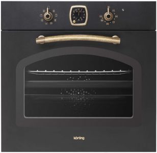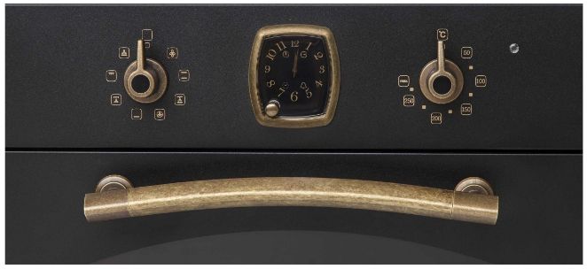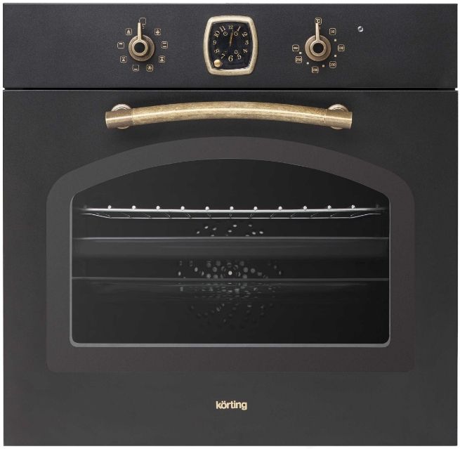 Встраиваемый электрический духовой шкаф Korting OKB 481 CRN в матовом черном цвете с бронзовой фурнитурой сочетает очарование ретро-дизайна коллекции Calabria и практичные технологии для повседневной готовки. Модель выделяется металлической панелью управления с поворотными переключателями под бронзу и аналоговыми часами с электронным таймером.