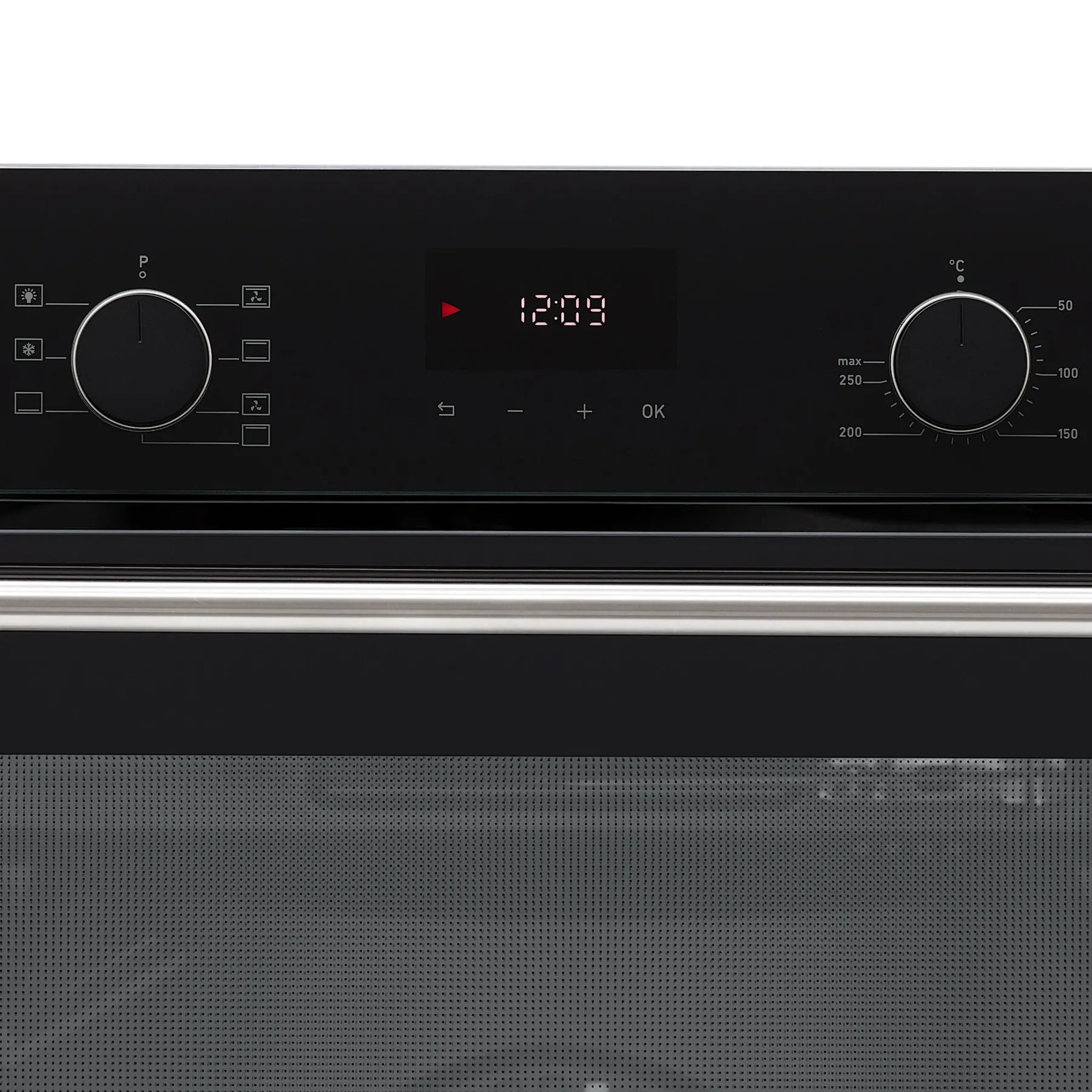- Элегантный чёрный дизайн с утапливаемыми регуляторами – корпус из термостойкого чёрного стекла дополнен утончённой ручкой и утапливаемыми переключателями, что придаёт духовке лаконичность и визуальную лёгкость.