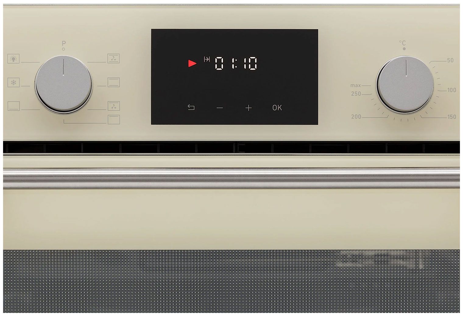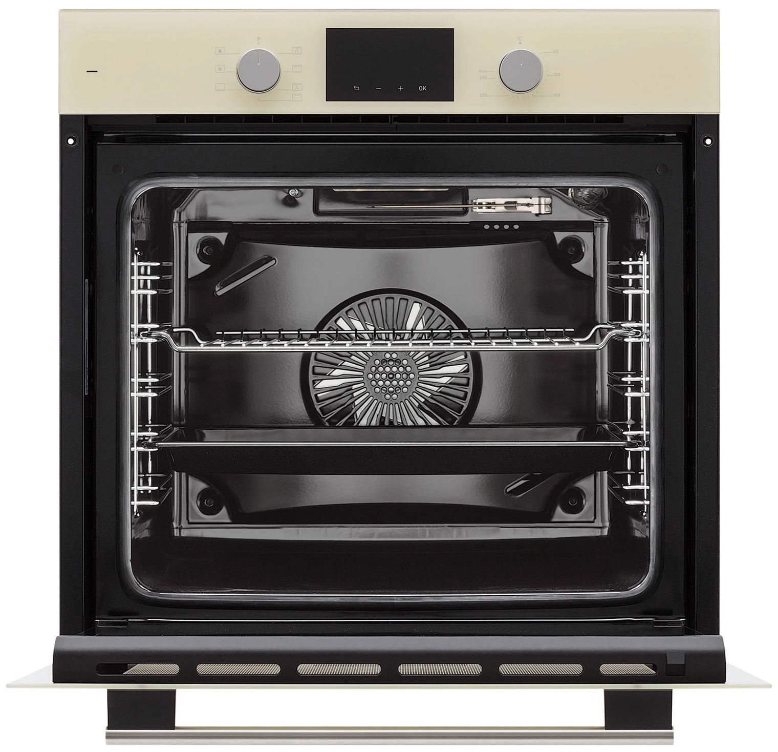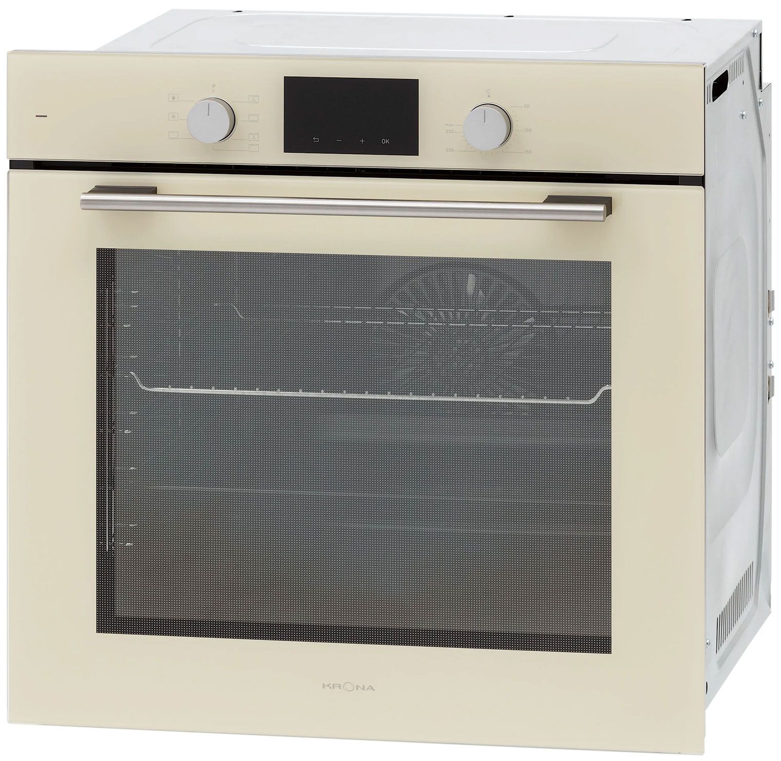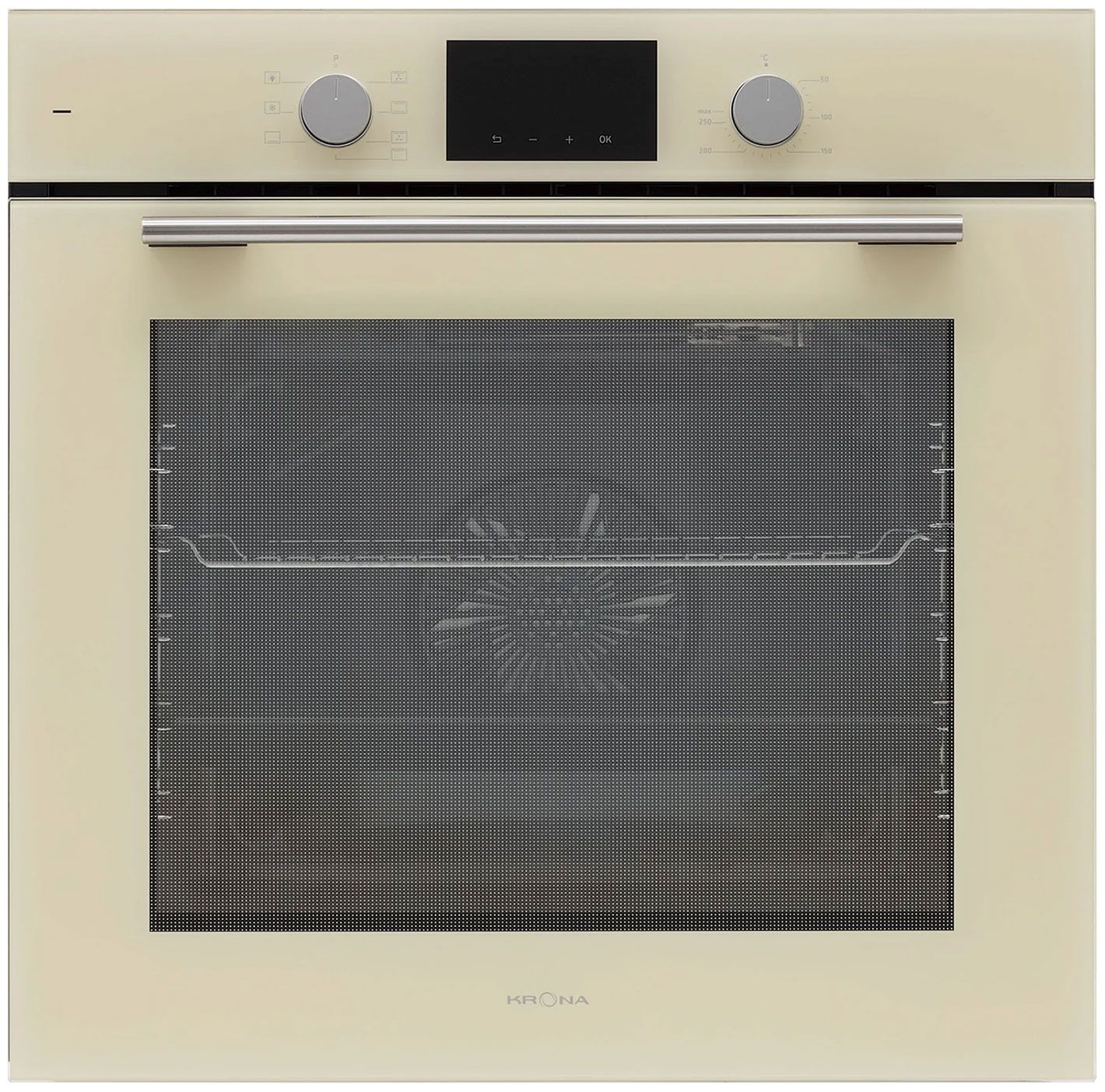 Электрический духовой шкаф Krona LEGENDE 60 IV в элегантном цвете «слоновая кость» сочетает премиальный дизайн и передовые технологии. Модель оснащена панорамной дверцей из закаленного стекла Schott Ceran, утапливаемыми регуляторами и стильной металлической ручкой, создавая эффект визуальной легкости.