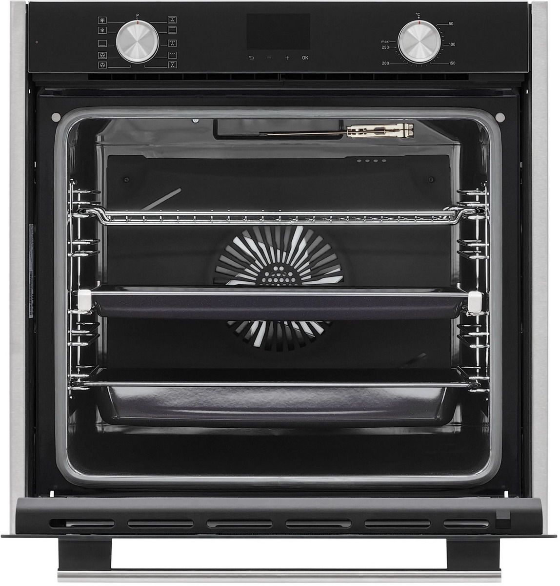 - Телескопические направляющие — полное и безопасное выдвижение противней. Удобство загрузки и контроля приготовления.