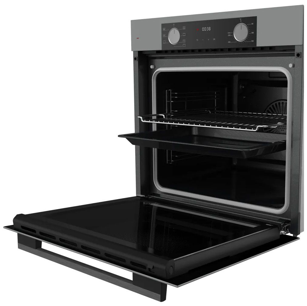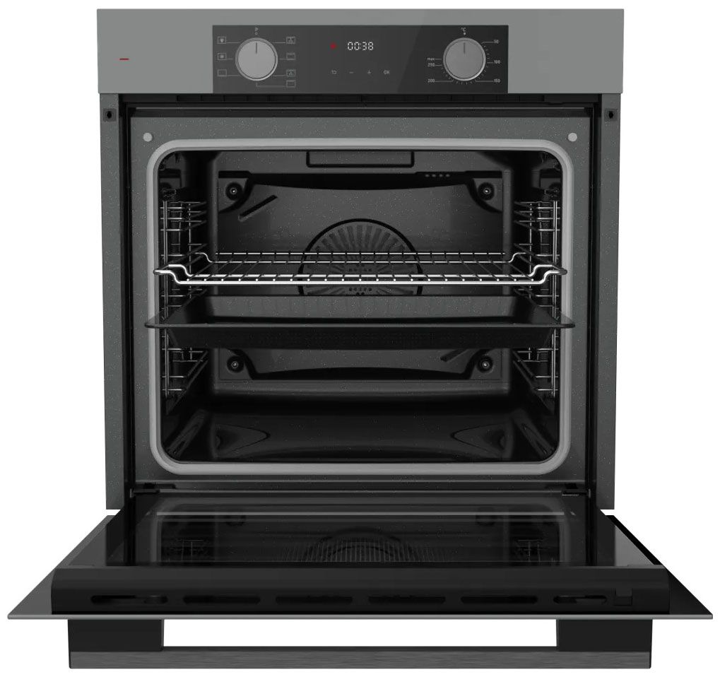Встраиваемый электрический духовой шкаф Kuppersberg HF 607 GR в сером цвете сочетает строгий европейский дизайн и функциональные решения для комфортного приготовления. Модель оснащена утапливаемыми поворотными переключателями, электронным дисплеем и съемной дверцей для удобства обслуживания.
