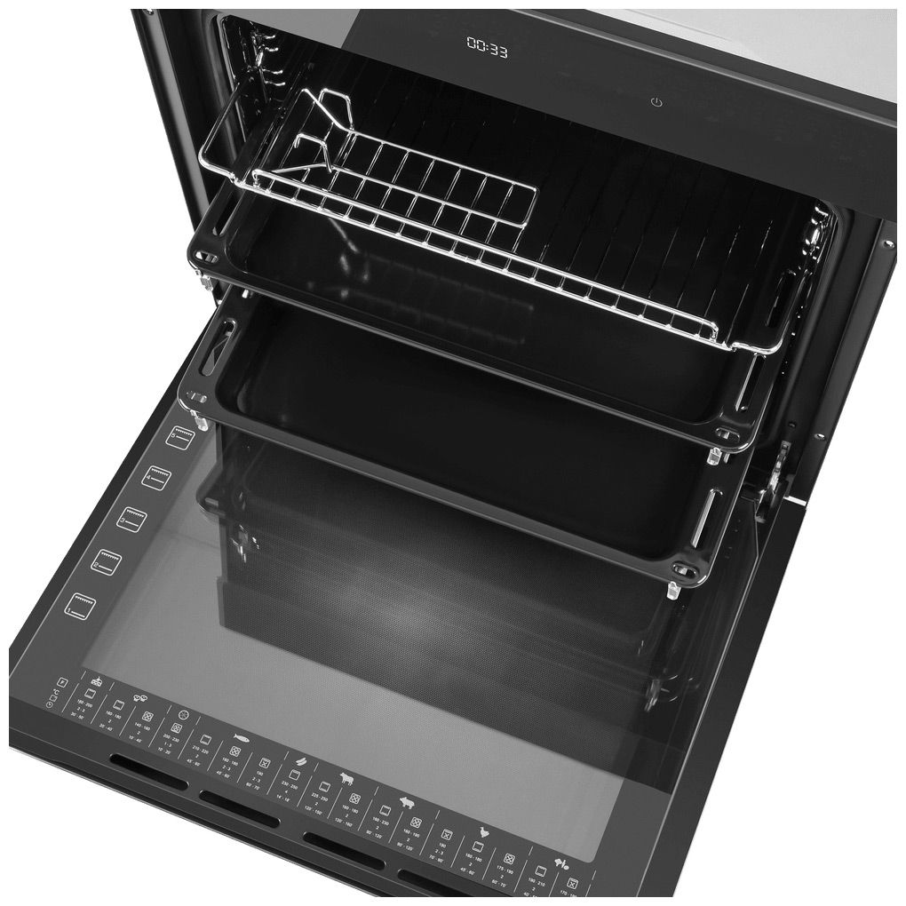 - Телескопические направляющие — полное и безопасное выдвижение противней на двух уровнях. Удобство загрузки и контроля приготовления.