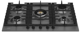 - 5 газовых конфорок разного типа с WOK-горелкой 4 кВт – центральная WOK-конфорка мощностью 4 кВт для быстрого нагрева и приготовления блюд азиатской кухни. Остальные конфорки: задняя правая 1.05–3 кВт, задняя левая и передняя левая по 0.6–1.75 кВт, передняя правая 0.48–1 кВт для деликатного томления.