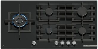 Газовая варочная панель Bosch PPM9A6I40 – это широкая 91.5-сантиметровая модель, созданная для просторных кухонь и любителей готовить много и разнообразно. Поверхность из стильного черного закаленного стекла сочетает прочность, легкий уход и современный дизайн. Модель оснащена пятью конфорками, включая мощный WOK и двухконтурную горелку, а также прочными чугунными решетками.