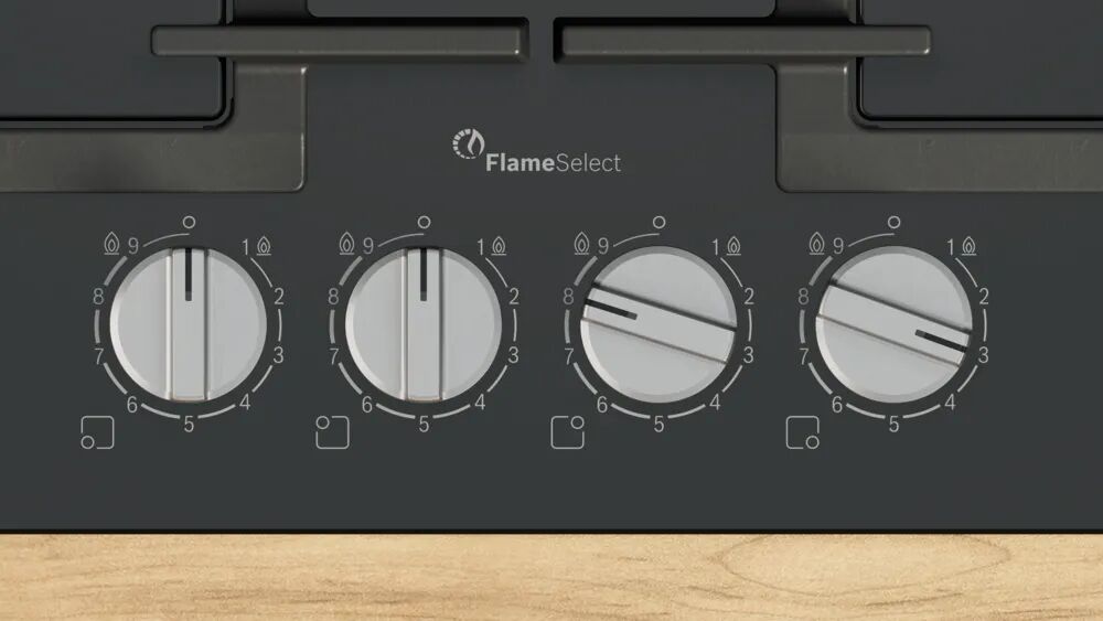 Газовая варочная панель Bosch PPP6A6I40 – классическая черная панель с точным контролем пламени FlameSelect