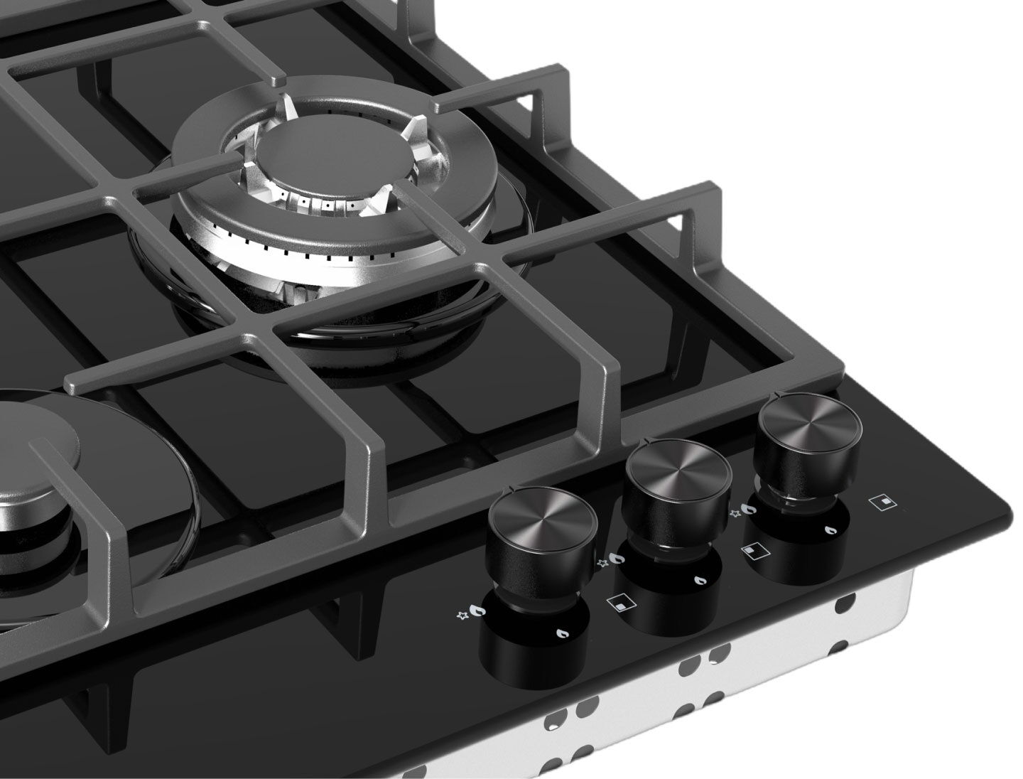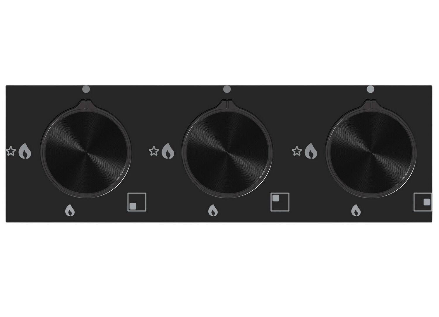 Узкая трёхконфорочная панель из закалённого стекла с газ-контролем и мощным нагревом для небольших кухонь