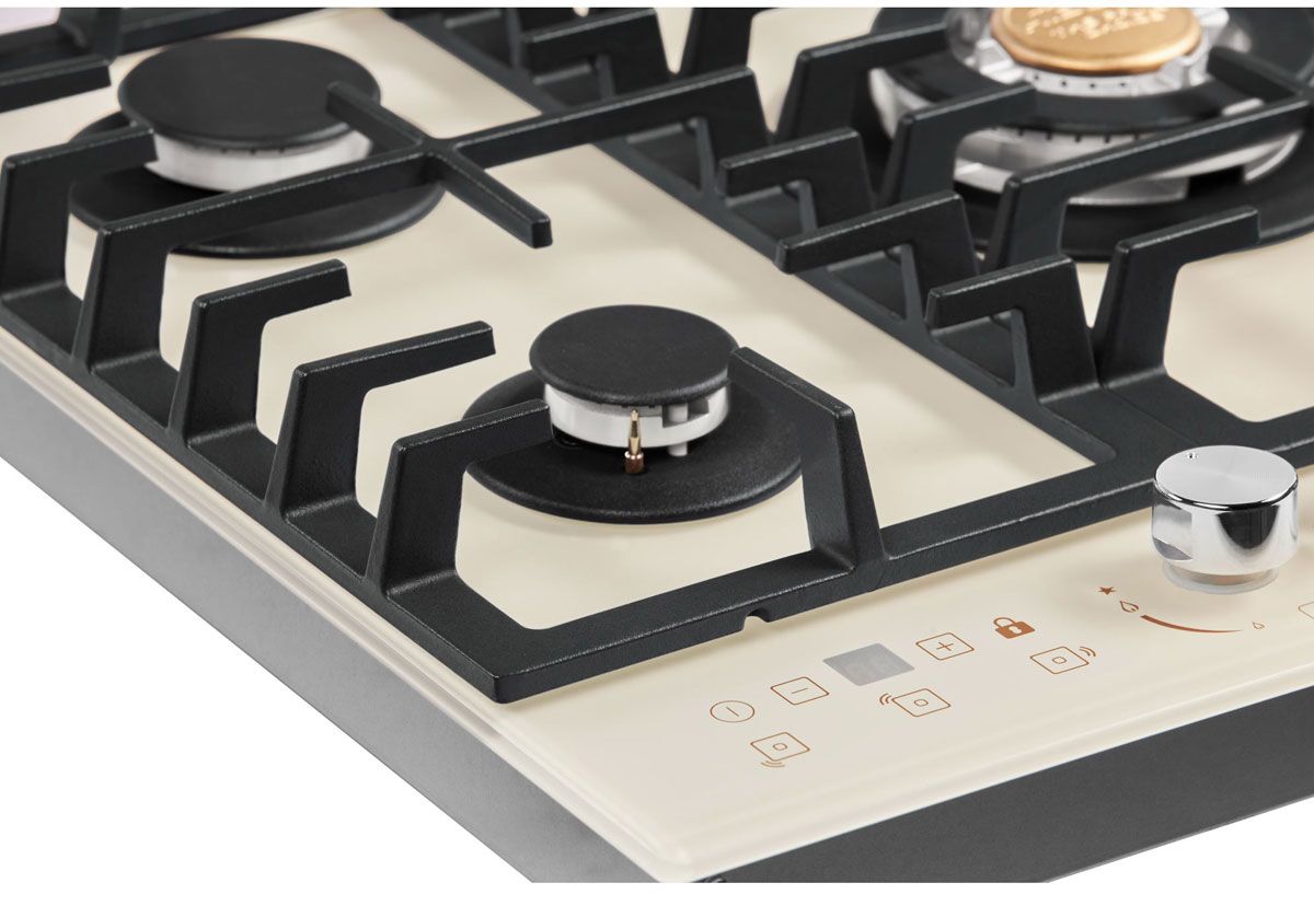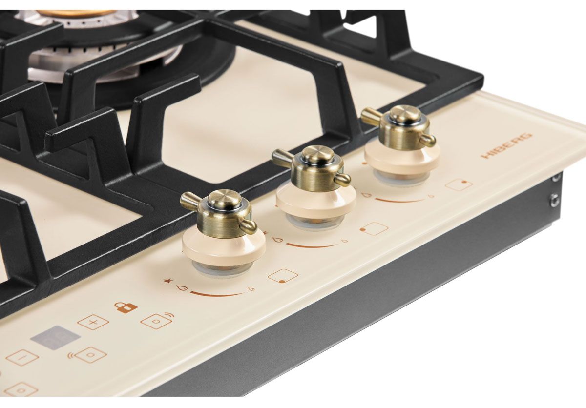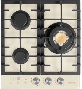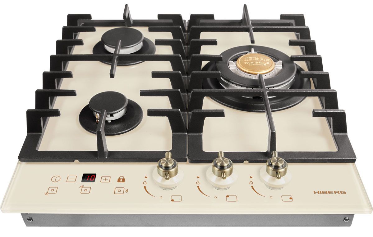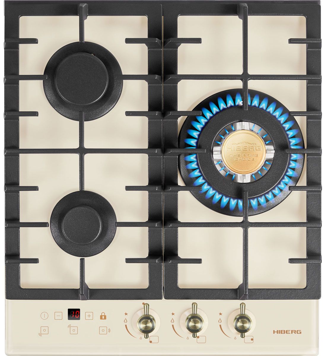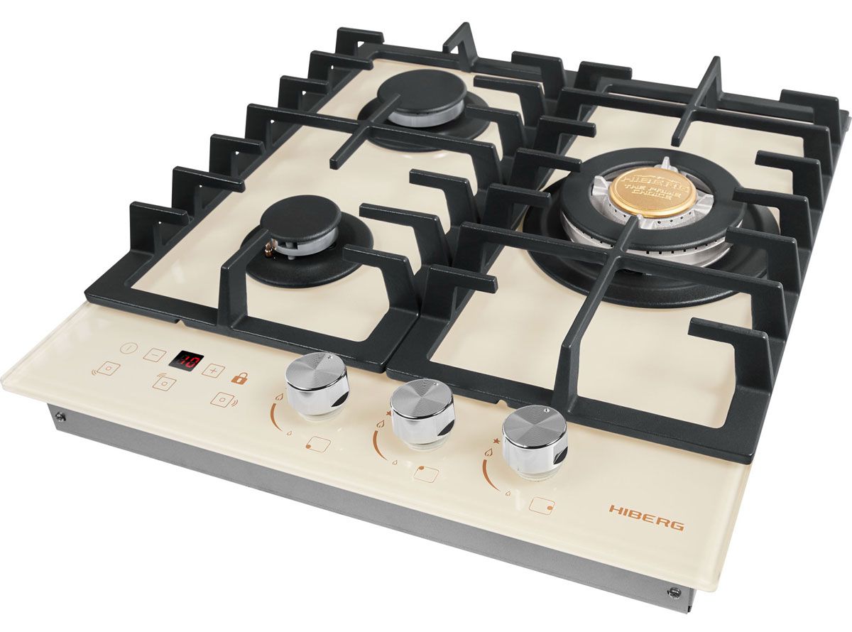 Газовая варочная панель Hiberg VM 4535 Y – бежевое стекло, 3 конфорки и интеллектуальный таймер в 45 см