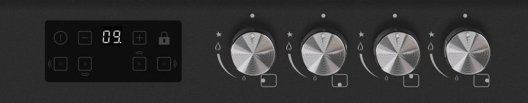 - Индивидуальный сенсорный таймер – программируемое автоотключение для каждой из 4 конфорок (1–99 мин). Точный контроль времени приготовления разных блюд со звуковым оповещением.