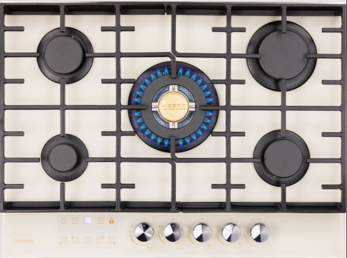 Газовая варочная панель Hiberg VM 7255 Y – бежевая стеклокерамика, 5 конфорок и сенсорный таймер в 70-см формате