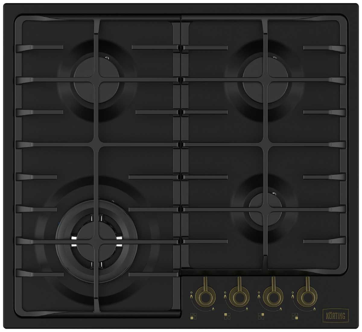 Встраиваемая газовая панель Korting HG 674 CTRN в матовом черном цвете с бронзовыми акцентами сочетает очарование ретро-коллекции Calabria и передовые инженерные решения. Модель с эмалированной поверхностью оснащена усиленными чугунными решетками и входит в линейку премиальной независимо встраиваемой техники.