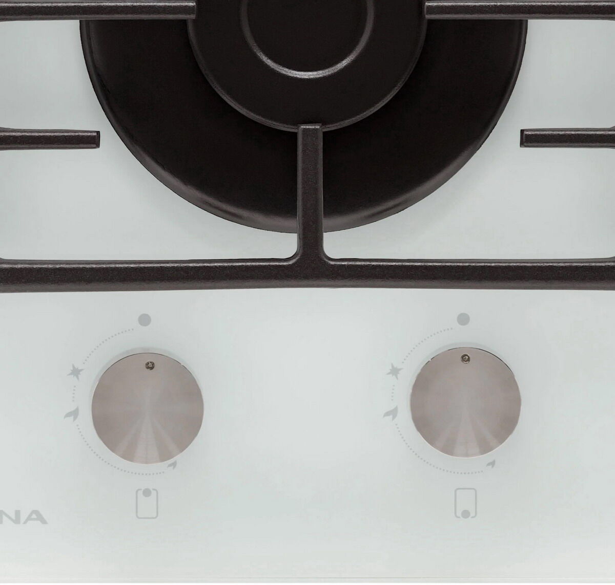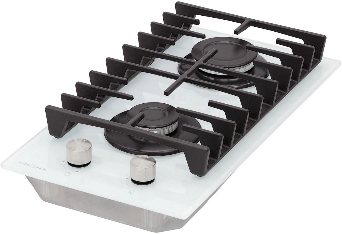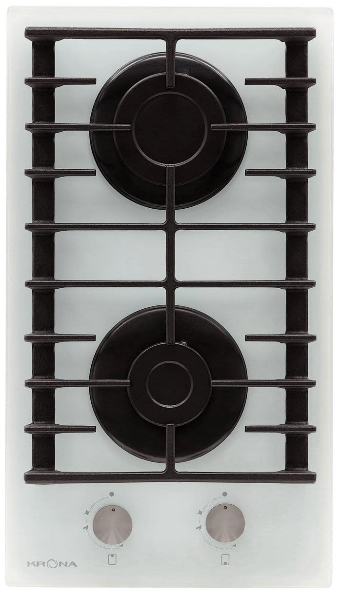 Газовая панель Krona HAGEL 30 WH – компактная двухконфорочная модель с мощной WOK-зоной и чугунной решеткой в белом цвете