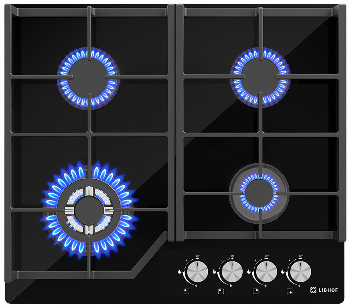 Газовая варочная панель Libhof GH-604B – премиальная мощность, четыре конфорки, WOK с тремя рядами пламени и чугунные решётки
