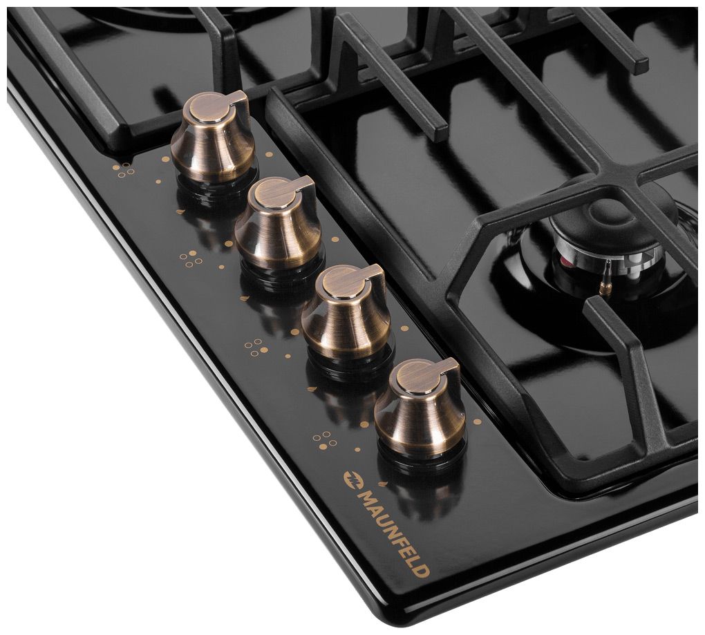 Газовая варочная панель Maunfeld EGHE.64.63CB.R/G в чёрном цвете с бронзовыми ручками – это топовая модель, сочетающая рекордную мощность WOK-горелки 3800 Вт, бескомпромиссную безопасность и эксклюзивный дизайн. Предназначена для тех, кто требует максимальной производительности и выразительной эстетики на своей кухне.