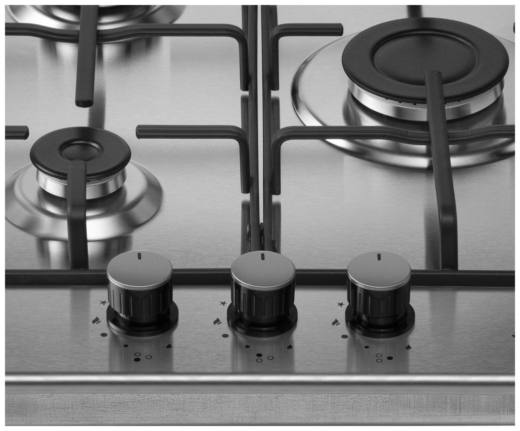 - Итальянские горелки SABAF – три конфорки разной мощности (2600, 1700, 1000 Вт) обеспечивают гибкий температурный контроль для всех способов приготовления: от быстрого обжаривания до деликатного томления.