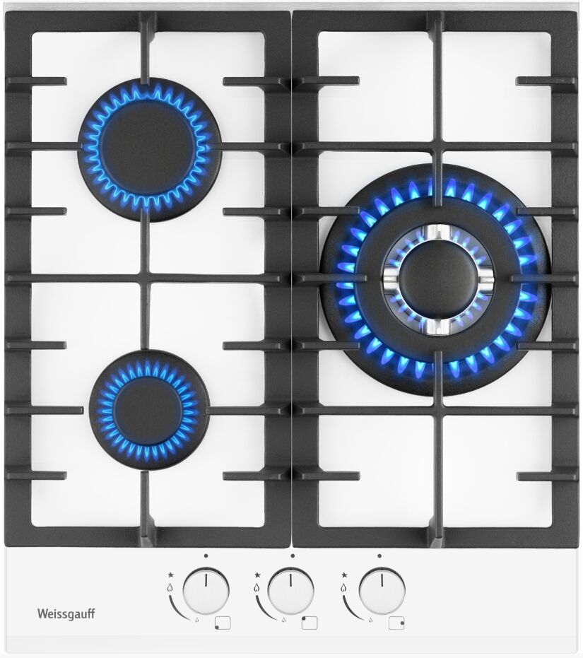 3 конфорки (включая WOK 3.4 кВт с двумя кольцами пламени), белое закалённое стекло, цельные чугунные решётки, автоматический электроподжиг и рукоятки Hi-Tech