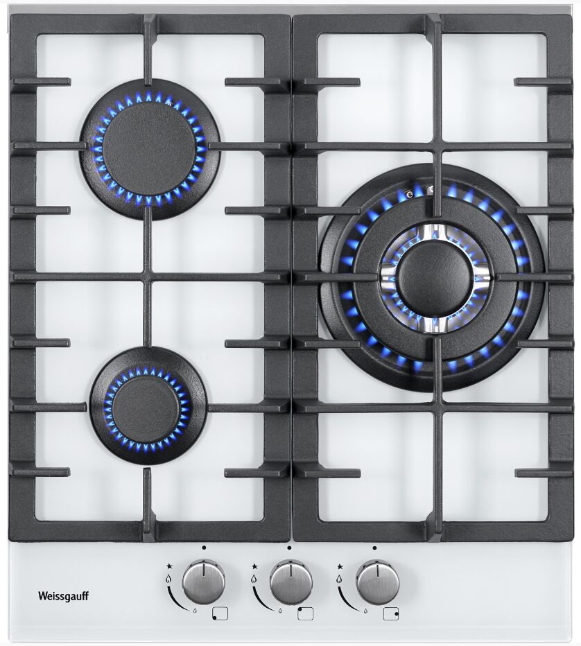 3 конфорки (включая WOK 3.4 кВт с тремя кольцами пламени), белое закалённое стекло, чугунные решётки, газ-контроль каждой конфорки, автоматический электроподжиг и рукоятки Hi-Tech