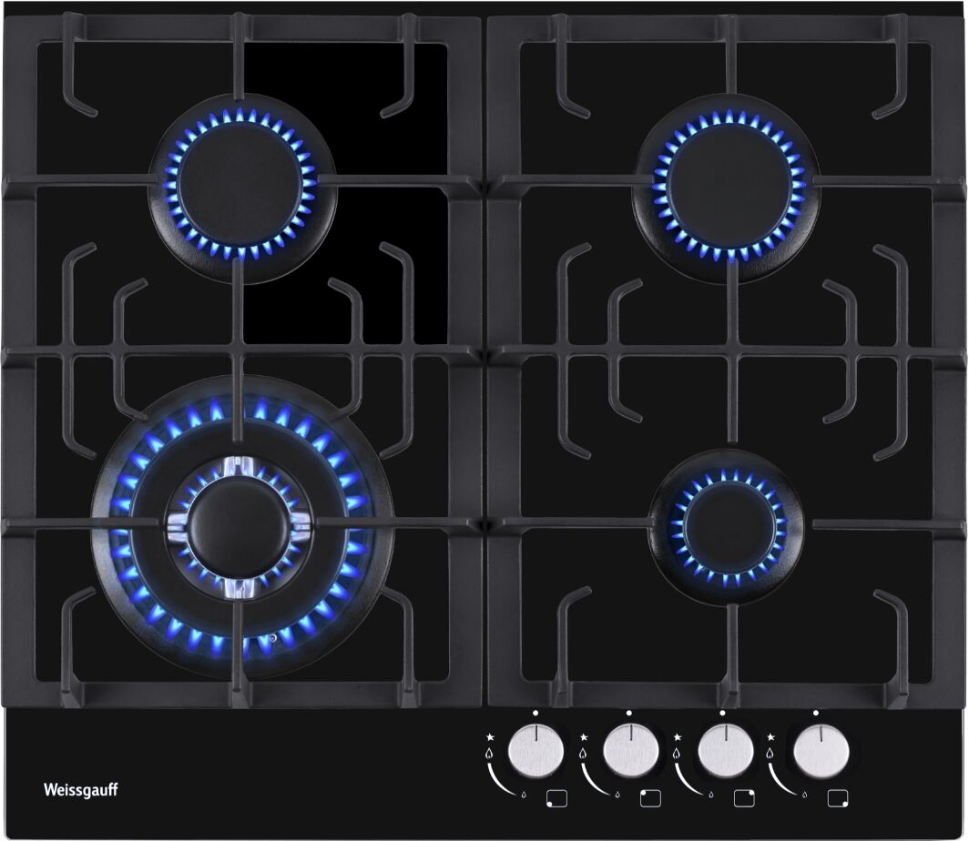 Газовая варочная панель Weissgauff HGG 641 BV – чёрное стекло, газ-контроль и эргономичные чугунные решётки
