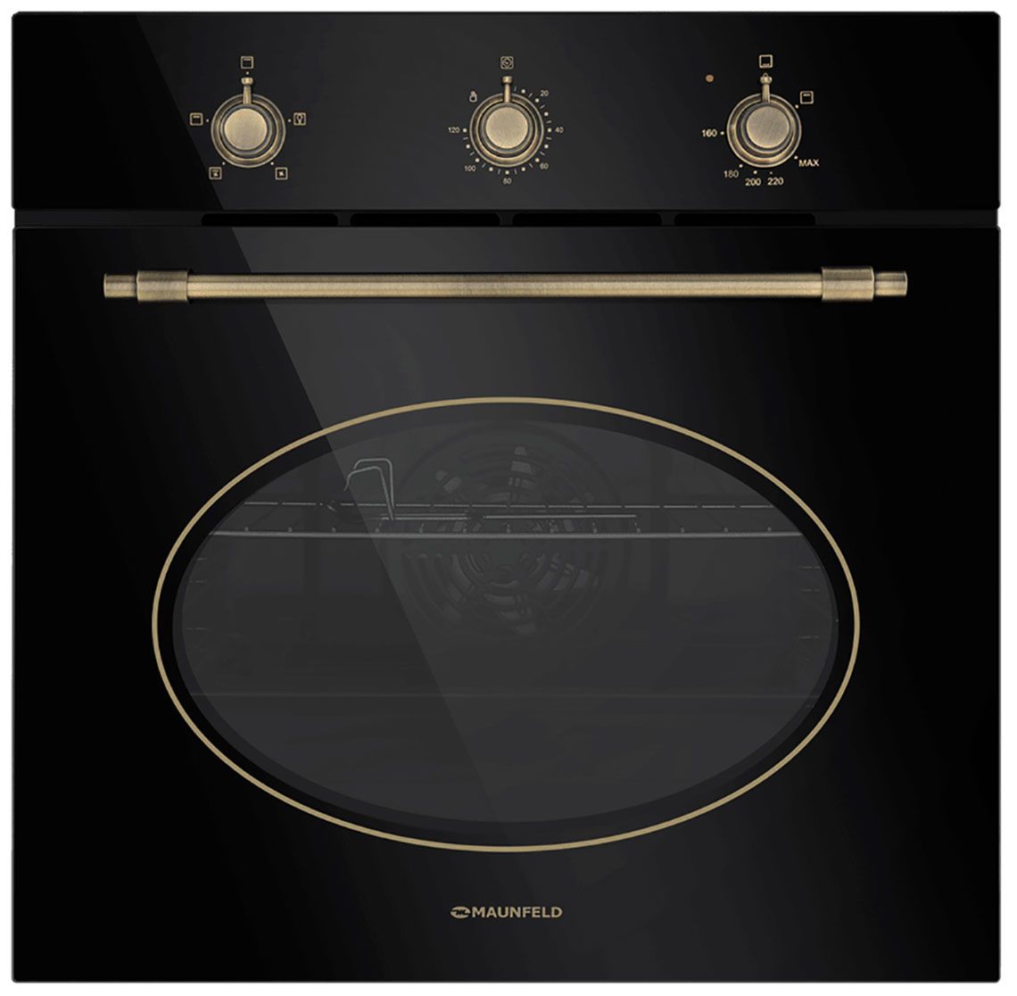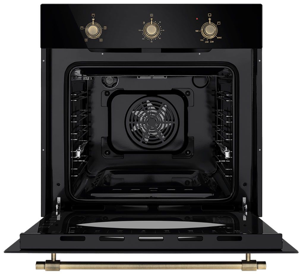 Газовый духовой шкаф Maunfeld EOGC604RBG.MT Slim сочетает элегантный дизайн в стиле «ретро» с черным стеклянным фасадом, бронзовыми акцентами и практичную функциональность. Модель отличается объемом 60 литров при стандартной ширине 60 см, что позволяет готовить несколько блюд одновременно.