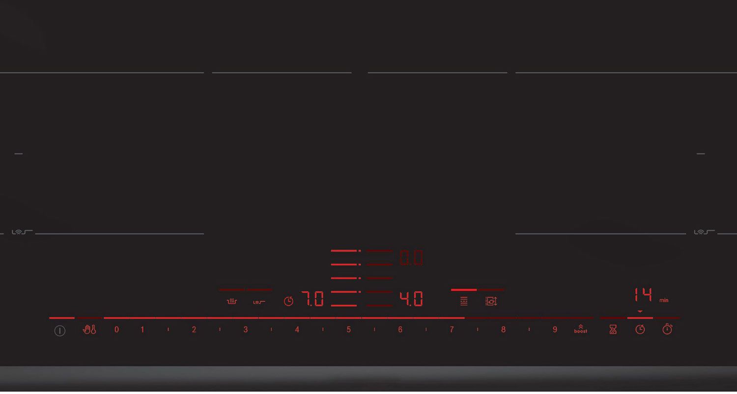 - 4 конфорки с FlexInduction – возможность объединения зон нагрева для посуды разного размера