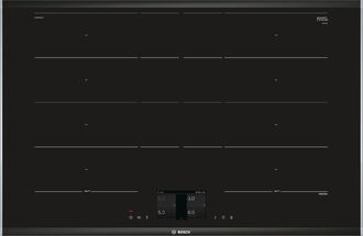 Индукционная варочная панель Bosch PXY875KW1E – это широкая 81.6-сантиметровая модель премиум-класса. Дизайн сочетает черную стеклокерамику со скошенным краем и защитный металлический профиль по бокам. Панель оснащена четырьмя конфорками, которые могут попарно объединяться в две большие зоны FlexInduction. Принадлежит к топовой серии Serie | 8.