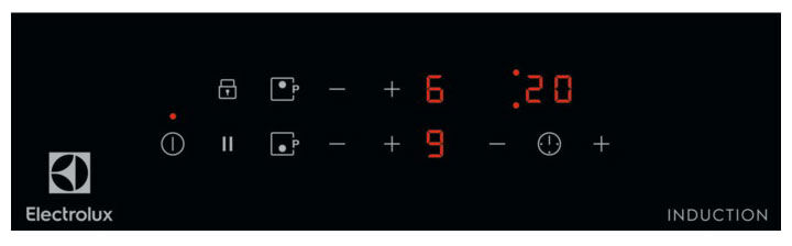 - Индикация мощности и остаточного тепла – каждая конфорка оснащена индикатором, отображающим уровень мощности и наличие остаточного тепла.