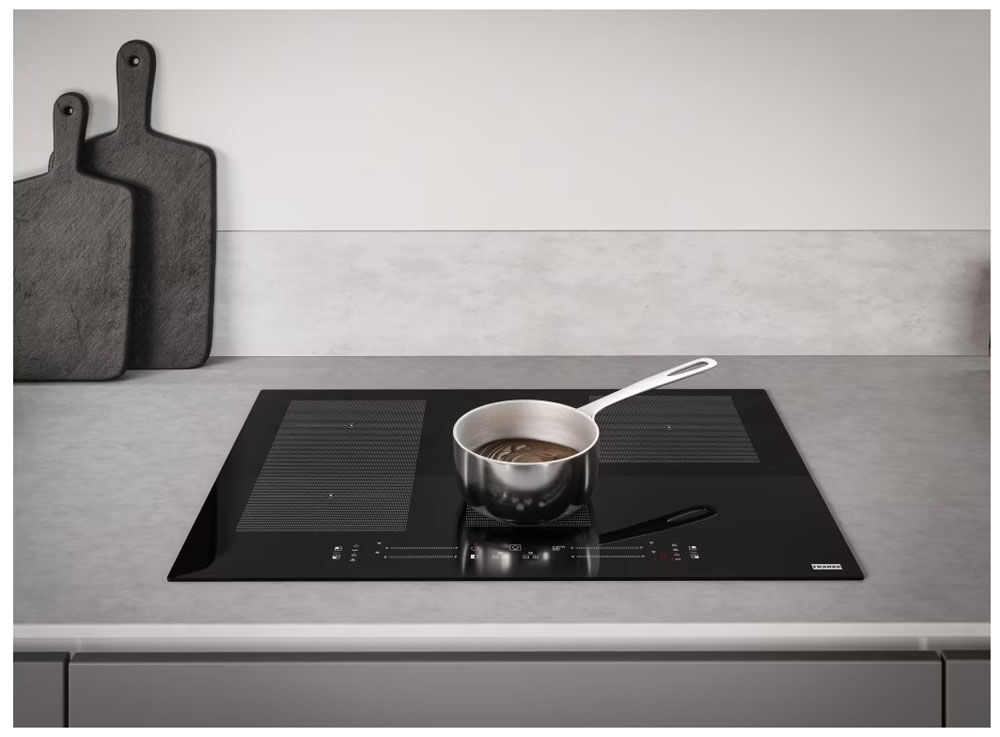 Премиальная индукционная варочная панель от швейцарского бренда Franke с шириной 77 см, 4 индукционными конфорками, функцией объединения зон FLEXI и интеллектуальной системой Cookassist