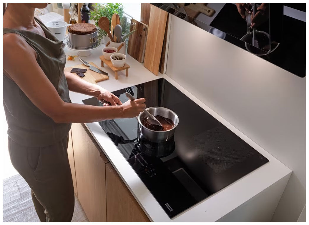 - 4 мощные индукционные конфорки – все четыре зоны нагрева реализованы по высокоэффективному индукционному принципу. Поверхность остается гладкой и удобной в уходе, а посуда прогревается точно на месте установки. Мгновенный нагрев и абсолютная безопасность.