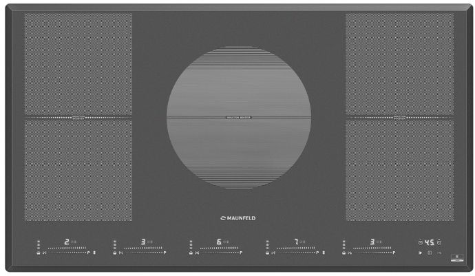 - Функция Booster (Турбо) – кратковременный импульс максимальной мощности для каждой из 5 зон нагрева. На овальной конфорке достигает 3000 Вт, обеспечивая сверхбыстрый старт приготовления.